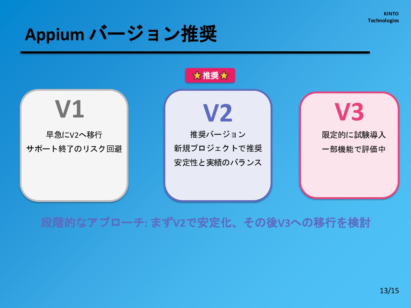 KINTO Technologies Appium バージョン推奨 V1 早急にV2へ移行 サポート終了のリスク回避 推奨 V2 推奨バージョン