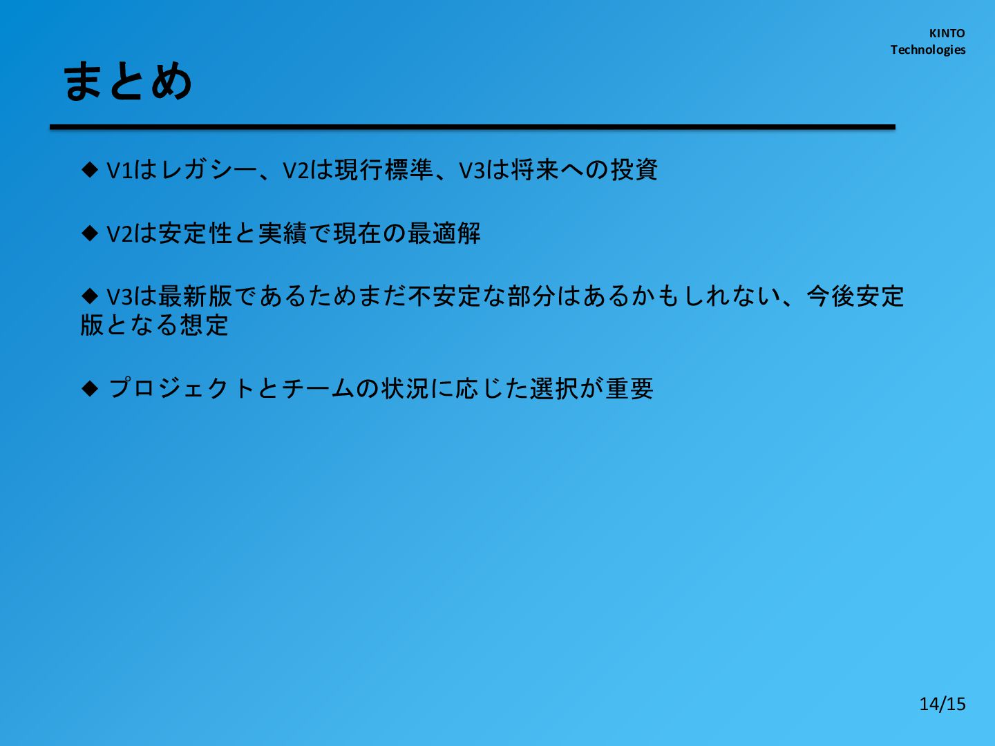 KINTO Technologies まとめ ◆ V1はレガシー、V2は現行標準、V3は将来への投資 ◆ V2は安定性と実績で現在の最適解 ◆ V3は最新版であるためまだ不安定な部分はあるかもしれない、今後安定 版となる想定