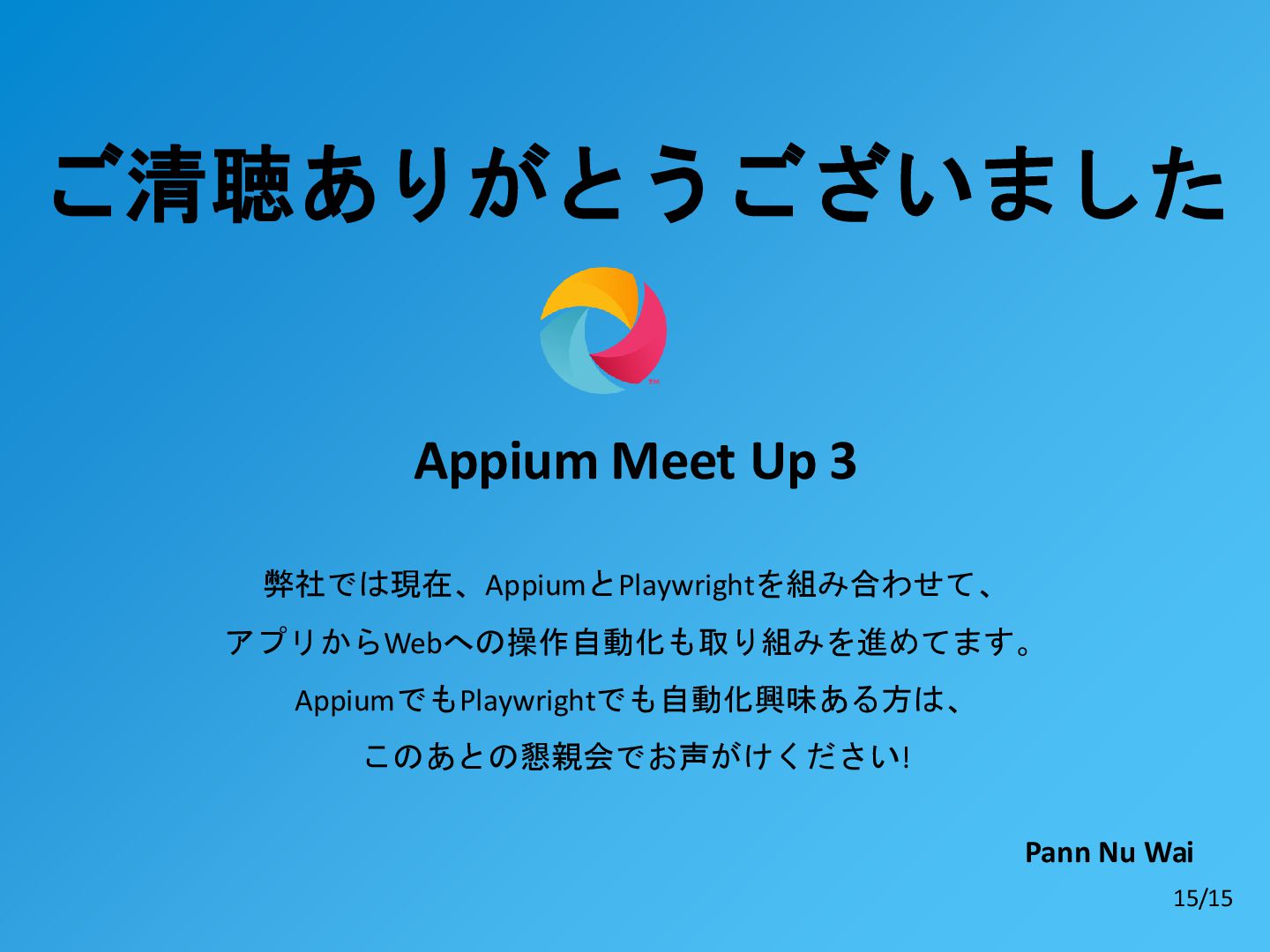 ご清聴ありがとうございました Appium Meet Up 3 弊社では現在、AppiumとPlaywrightを組み合わせて、 アプリからWebへの操作自動化も取り組みを進めてます。 AppiumでもPlaywrightでも自動化興味ある方は、 このあとの懇親会でお声がけください! Pann