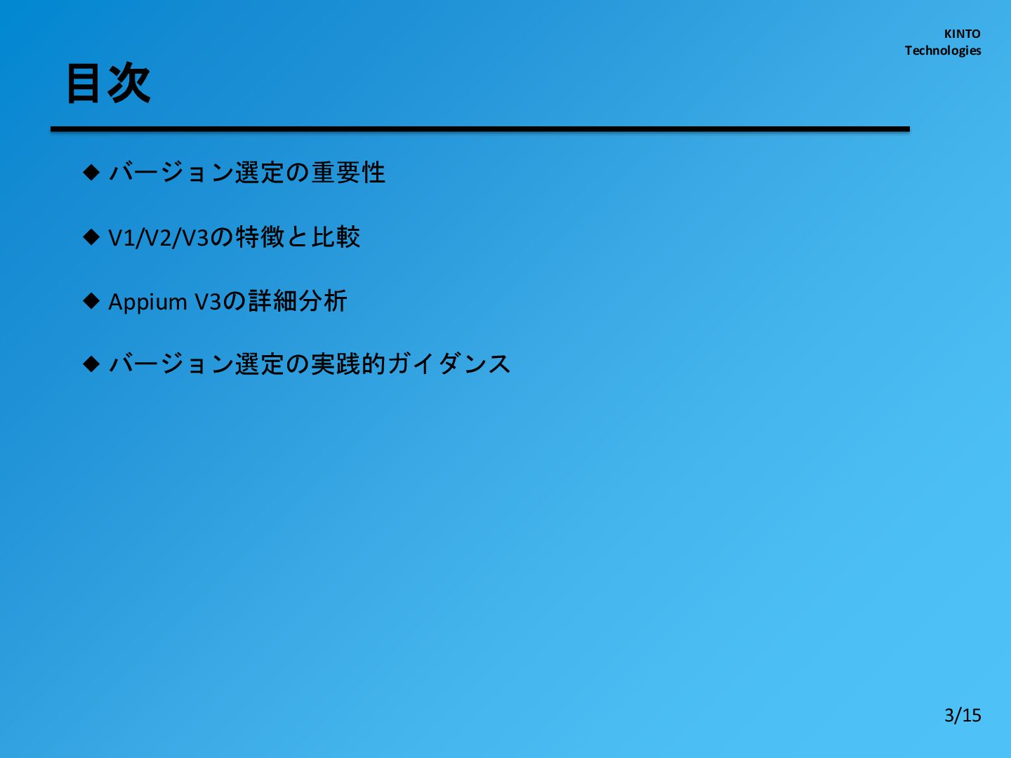KINTO Technologies 目次 ◆ バージョン選定の重要性 ◆ V1/V2/V3の特徴と比較 ◆ Appium V3の詳細分析