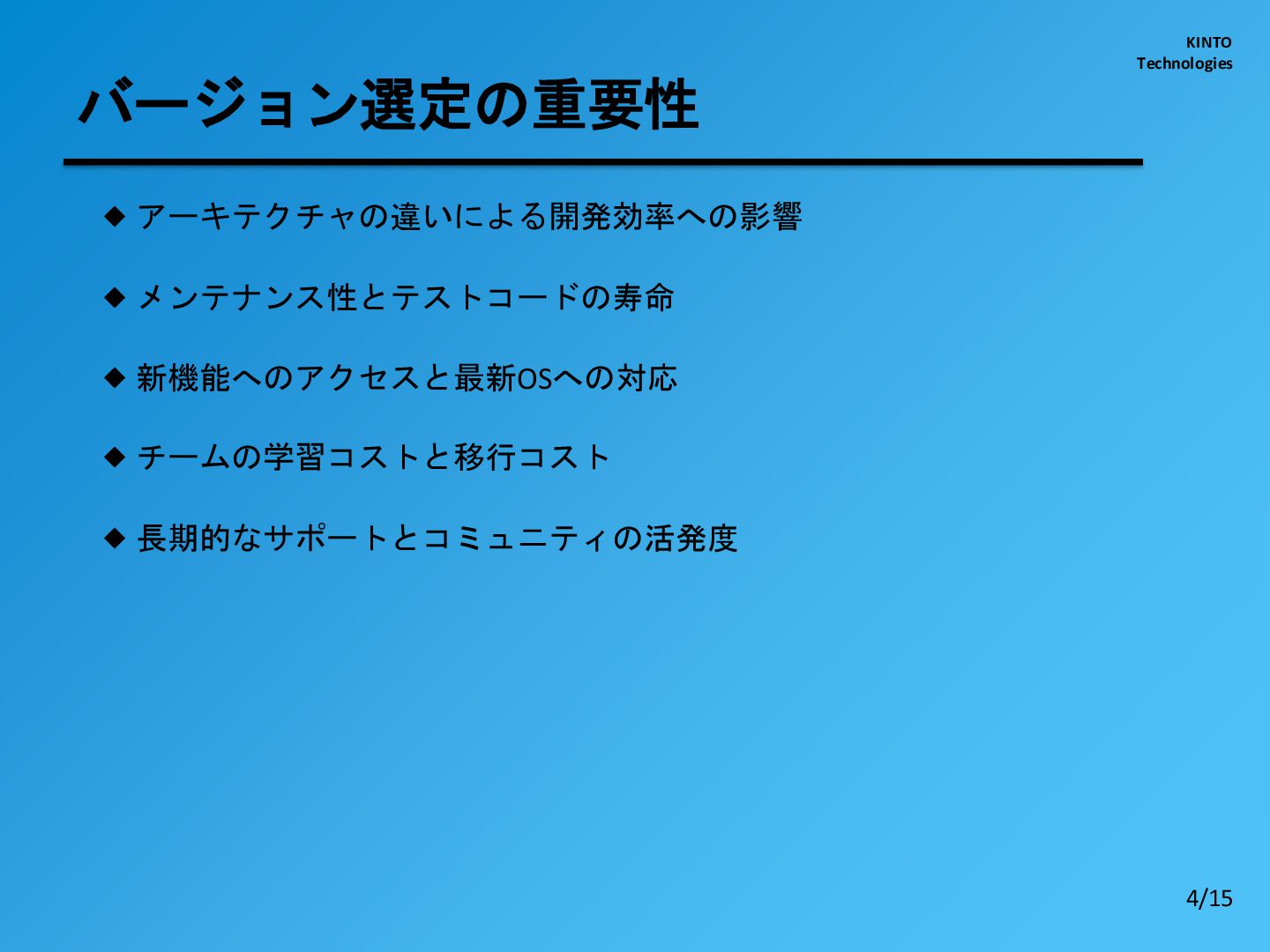 KINTO Technologies バージョン選定の重要性 ◆ アーキテクチャの違いによる開発効率への影響 ◆ メンテナンス性とテストコードの寿命 ◆ 新機能へのアクセスと最新OSへの対応 ◆