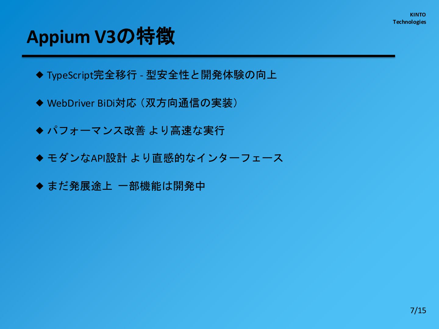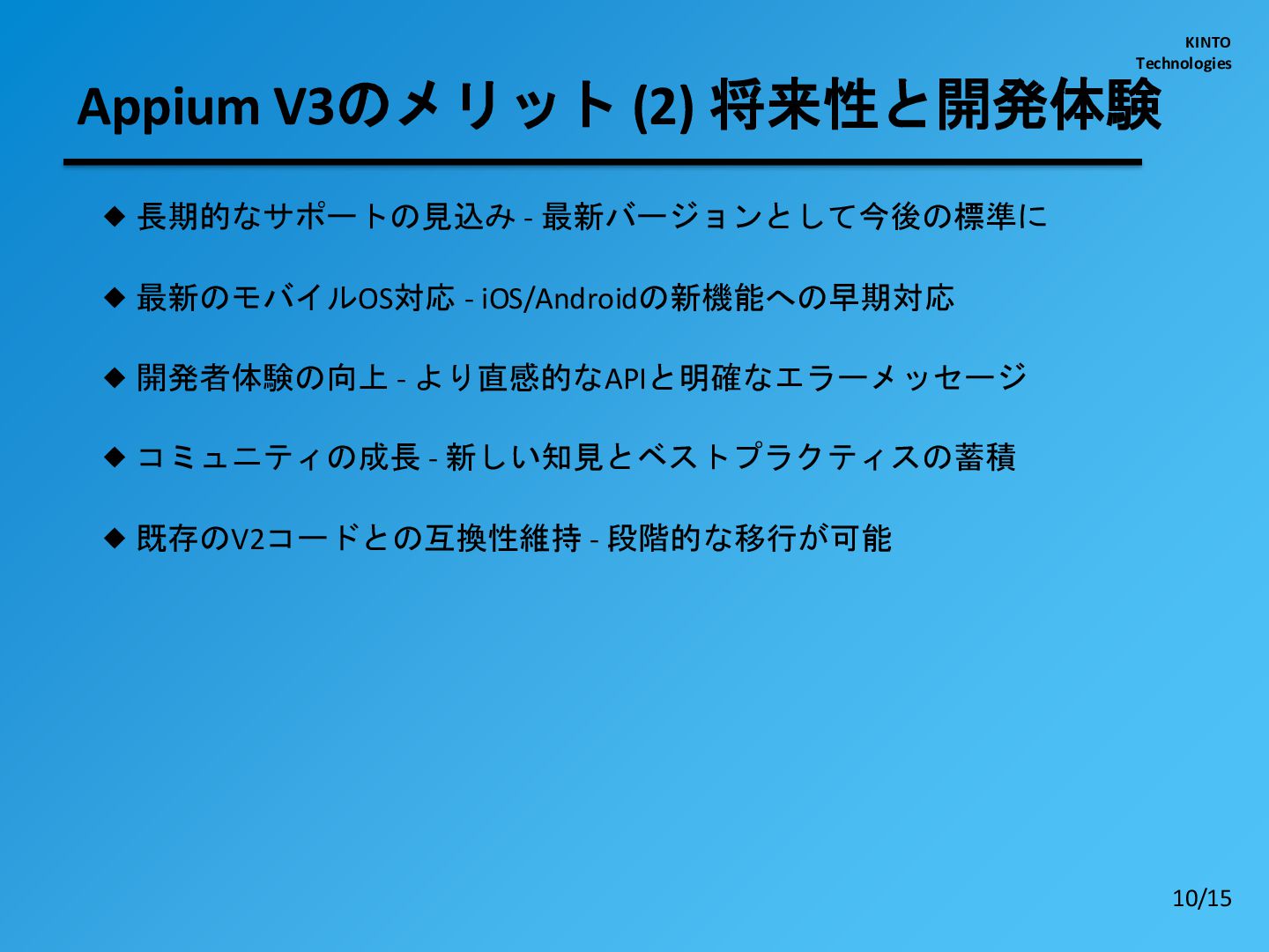 KINTO Technologies Appium V3のメリット (2) 将来性と開発体験 ◆ 長期的なサポートの見込み - 最新バージョンとして今後の標準に