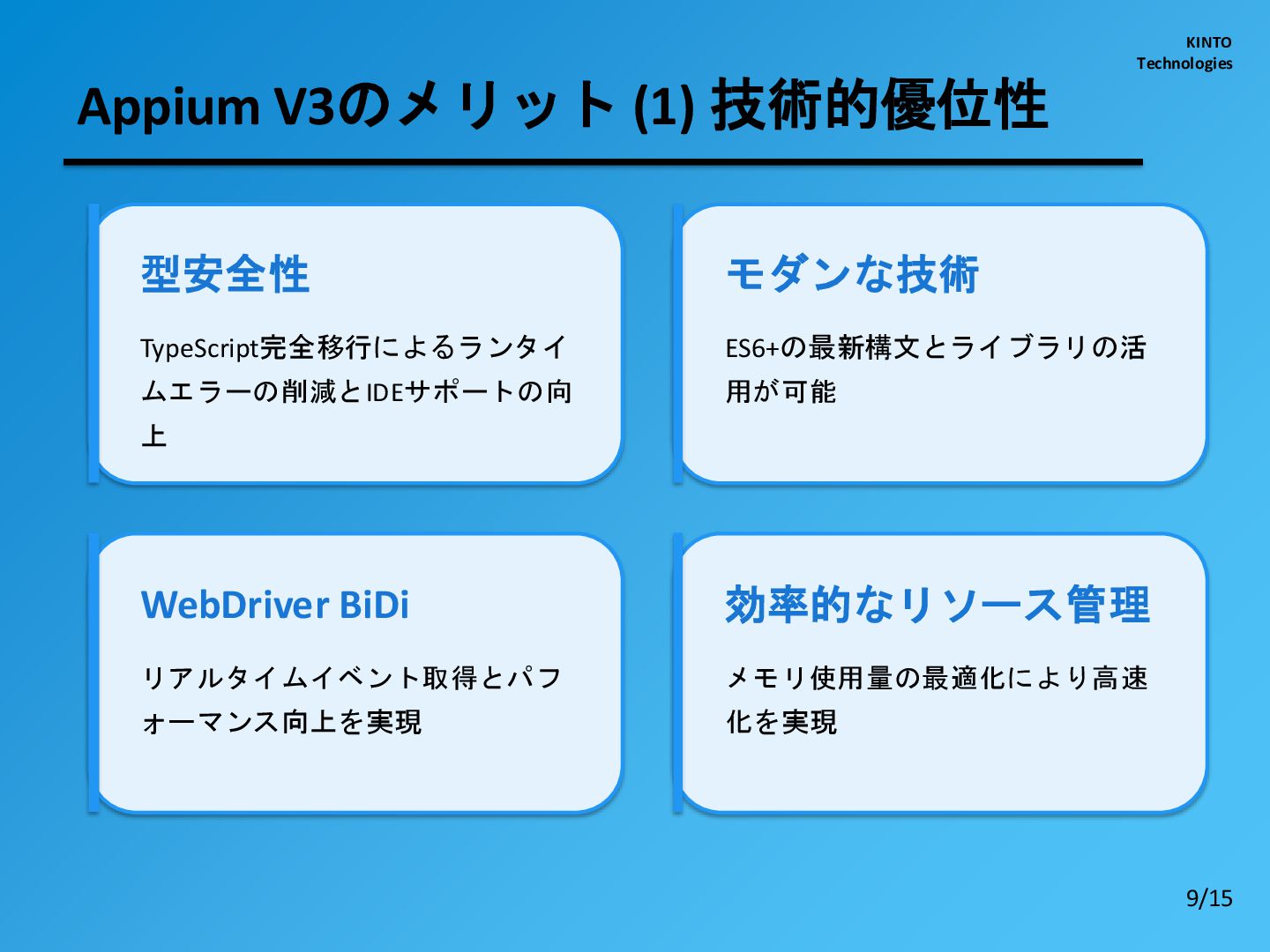 KINTO Technologies Appium V3のメリット (1) 技術的優位性 型安全性 TypeScript完全移行によるランタイ ムエラーの削減とIDEサポートの向 上