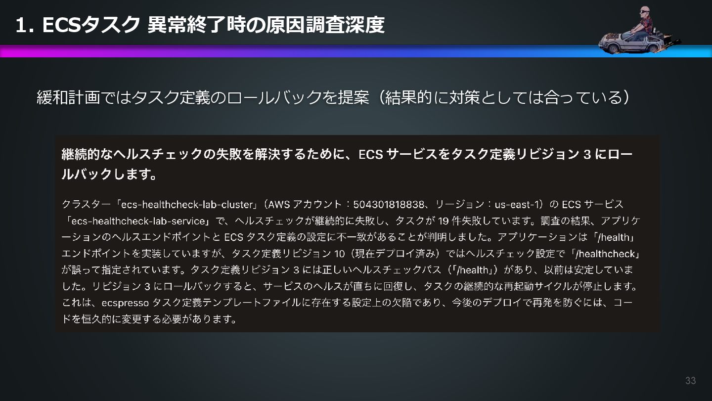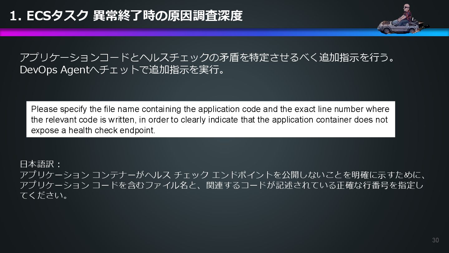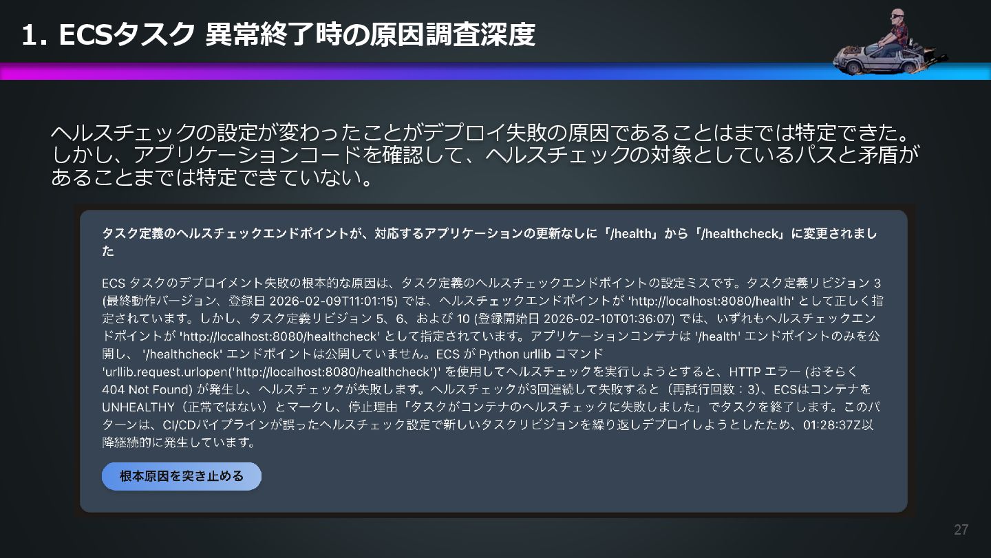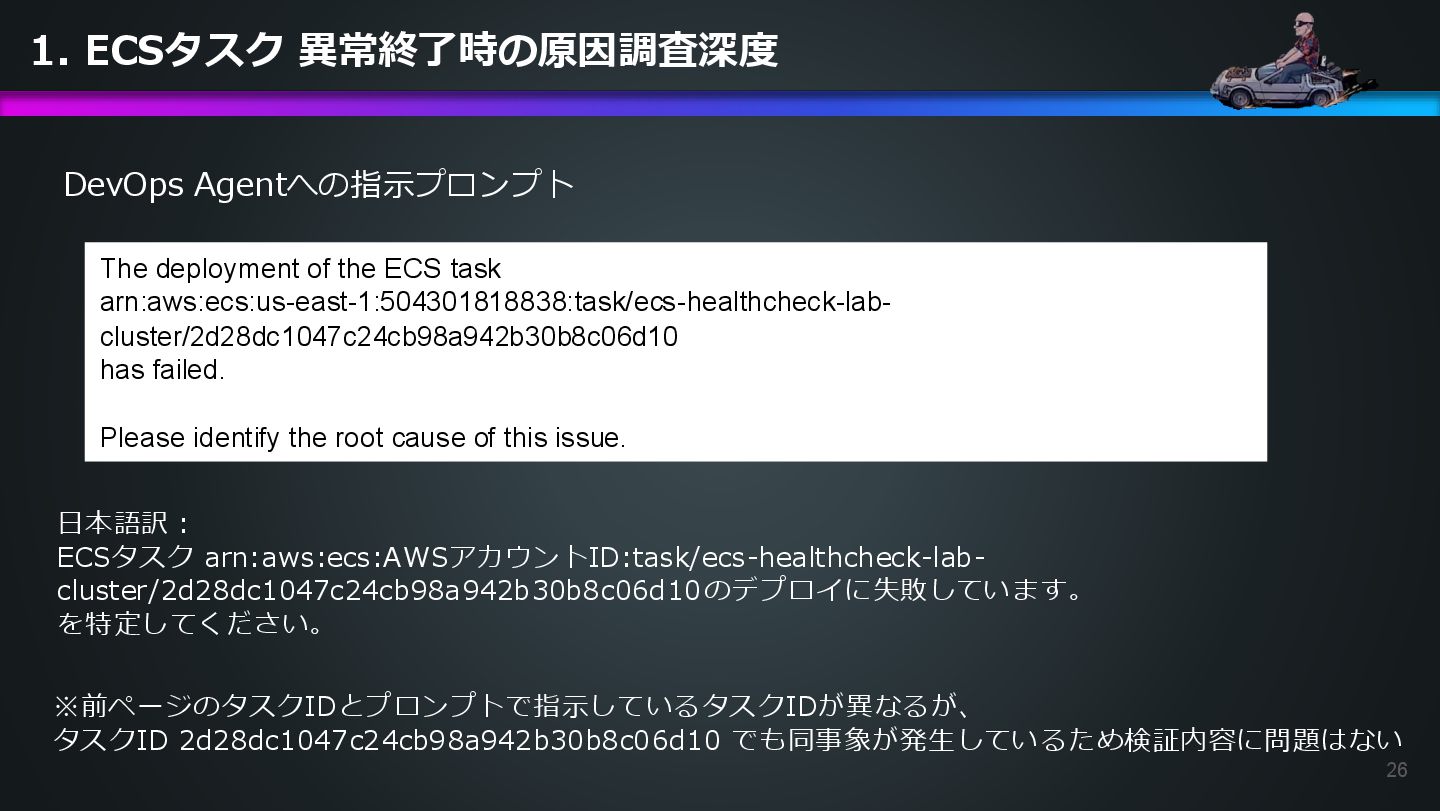arn:aws:ecs:us-east-1:504301818838:task/ecs-healthcheck-lab- cluster/2d28dc1047c24cb98a942b30b8c06d10 has failed. Please identify the root cause of this issue. DevOps Agentへの指示プロンプト ※前ページのタスクIDとプロンプトで指示しているタスクIDが異なるが、 タスクID 2d28dc1047c24cb98a942b30b8c06d10 でも同事象が発生しているため検証内容に問題はない 日本語訳: ECSタスク arn:aws:ecs:AWSアカウントID:task/ecs-healthcheck-lab- cluster/2d28dc1047c24cb98a942b30b8c06d10のデプロイに失敗しています。 を特定してください。