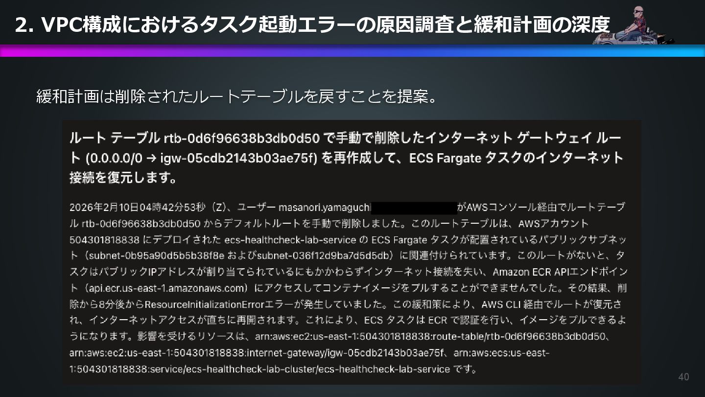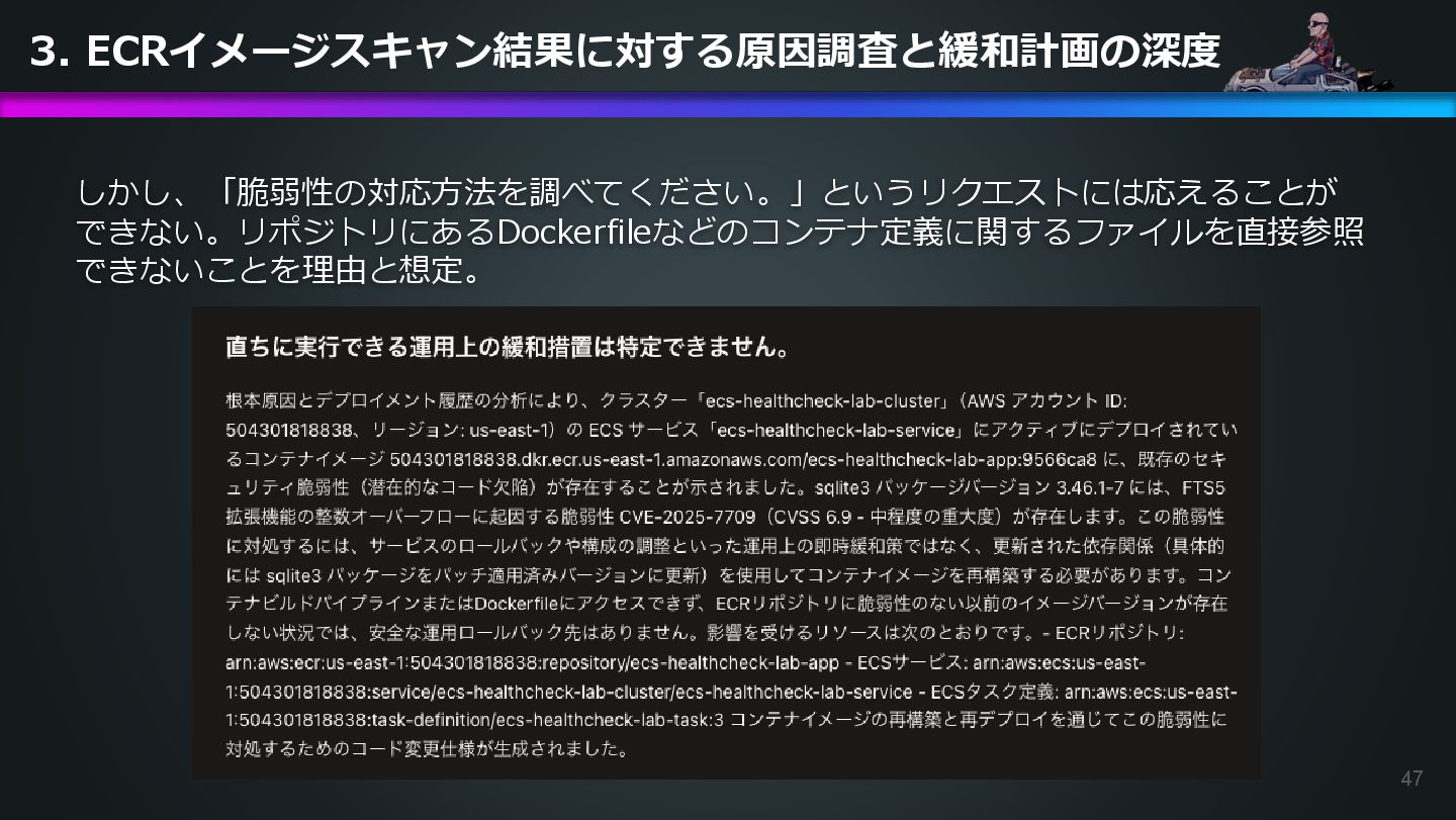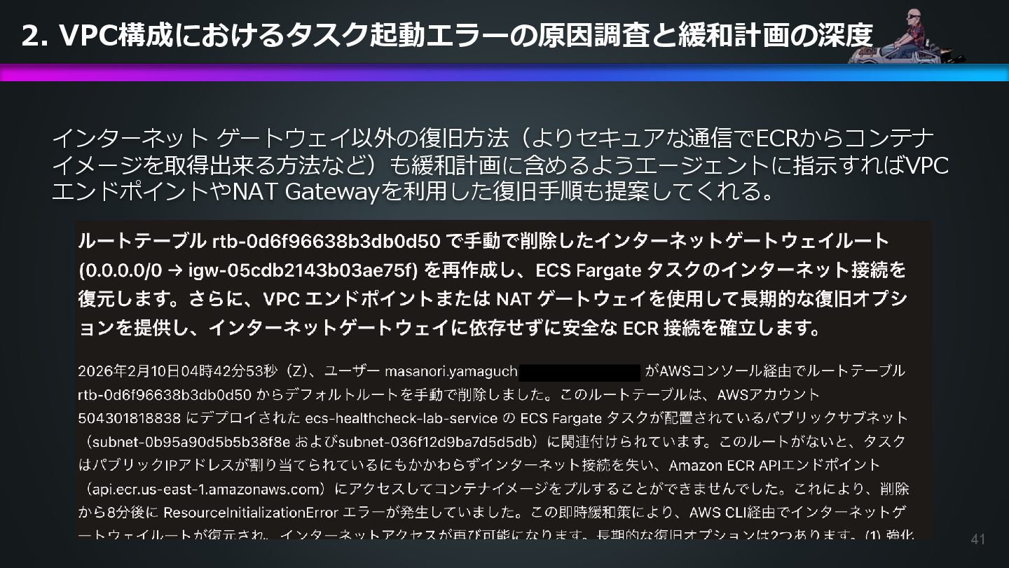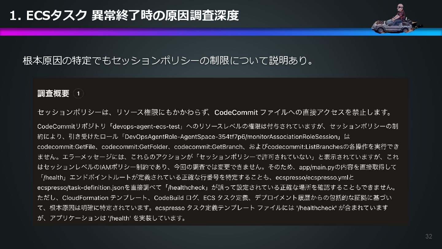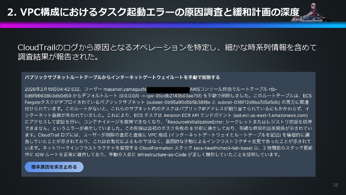 arn:aws:ecs:us-east-1:504301818838:task/ecs-healthcheck-lab- cluster/2d28dc1047c24cb98a942b30b8c06d10 has failed. Please identify the root cause of this issue. DevOps Agentへの指示プロンプト ※前ページのタスクIDとプロンプトで指示しているタスクIDが異なるが、 タスクID 2d28dc1047c24cb98a942b30b8c06d10 でも同事象が発生しているため検証内容に問題はない 日本語訳: ECSタスク arn:aws:ecs:AWSアカウントID:task/ecs-healthcheck-lab- cluster/2d28dc1047c24cb98a942b30b8c06d10のデプロイに失敗しています。 を特定してください。