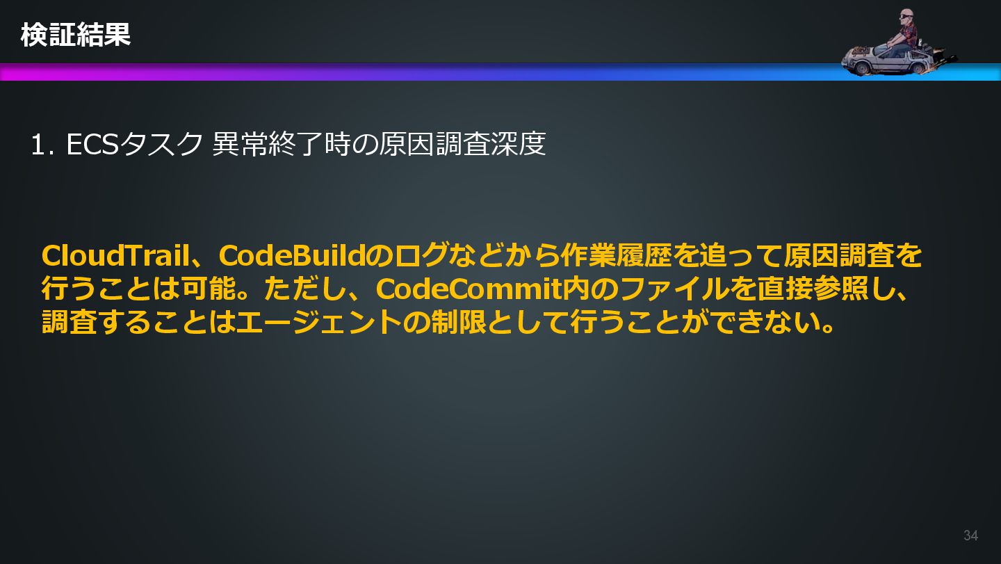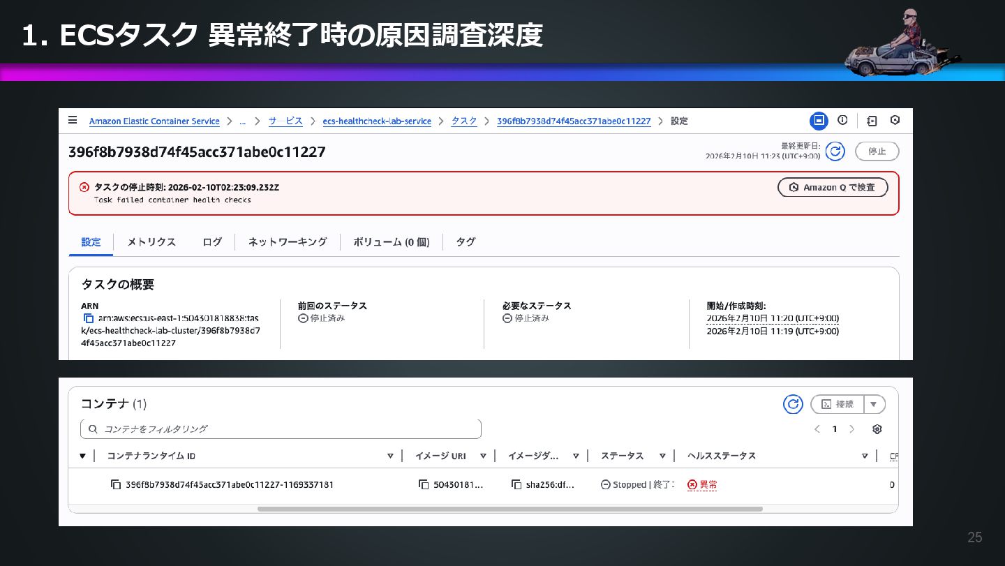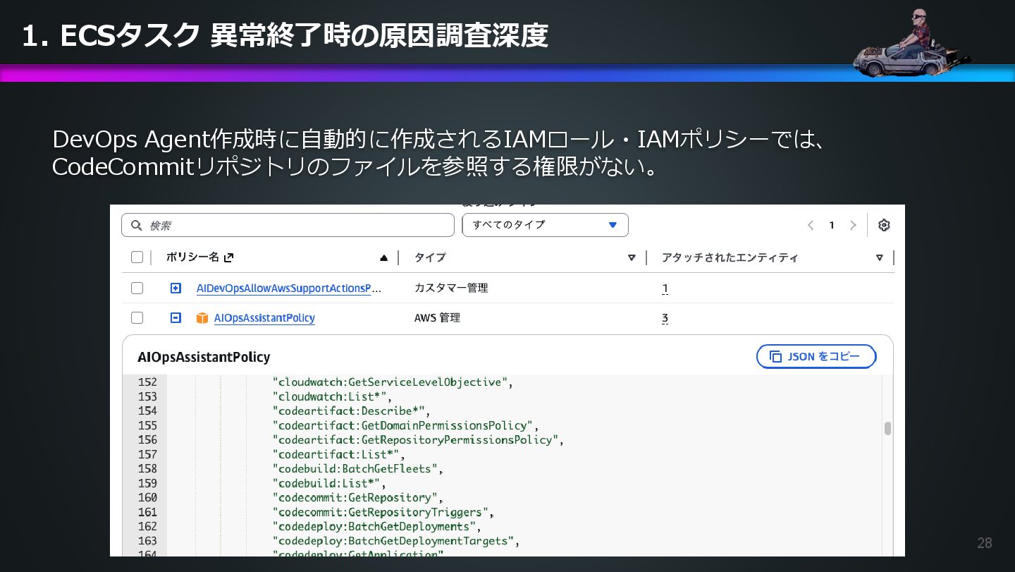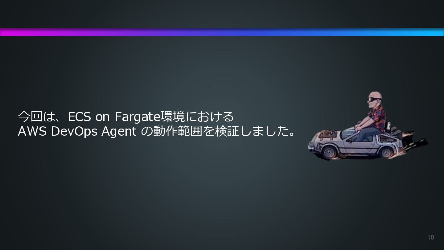 arn:aws:ecs:us-east-1:504301818838:task/ecs-healthcheck-lab- cluster/2d28dc1047c24cb98a942b30b8c06d10 has failed. Please identify the root cause of this issue. DevOps Agentへの指示プロンプト ※前ページのタスクIDとプロンプトで指示しているタスクIDが異なるが、 タスクID 2d28dc1047c24cb98a942b30b8c06d10 でも同事象が発生しているため検証内容に問題はない 日本語訳: ECSタスク arn:aws:ecs:AWSアカウントID:task/ecs-healthcheck-lab- cluster/2d28dc1047c24cb98a942b30b8c06d10のデプロイに失敗しています。 を特定してください。