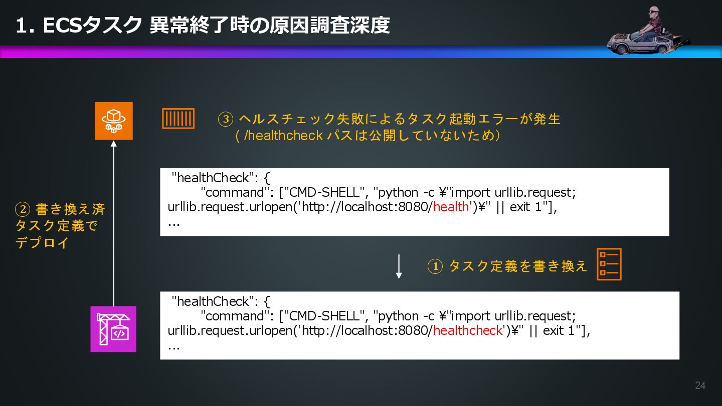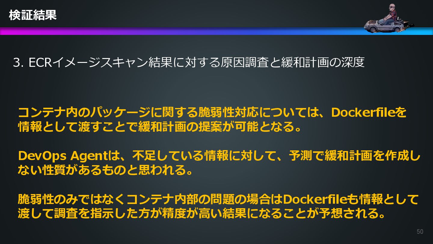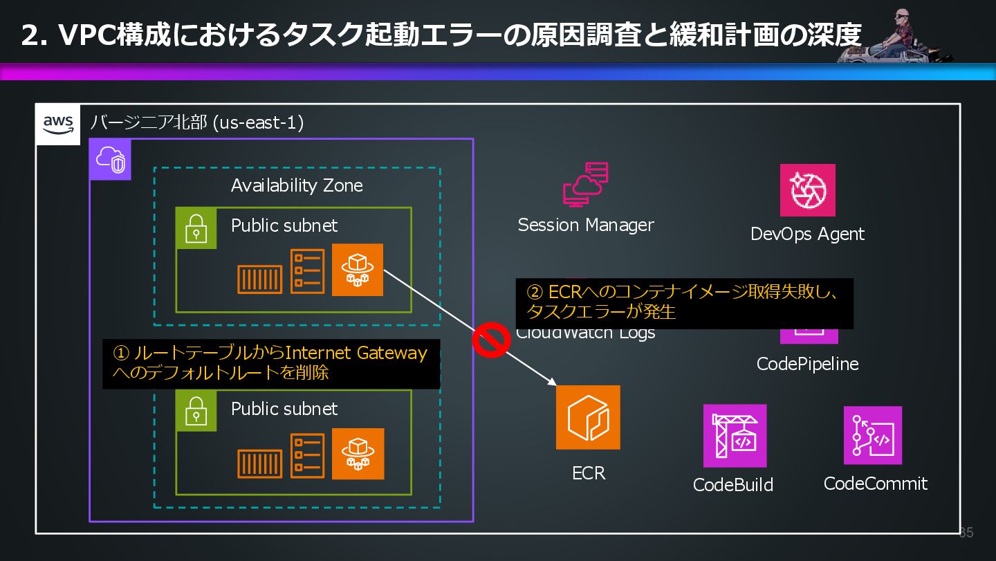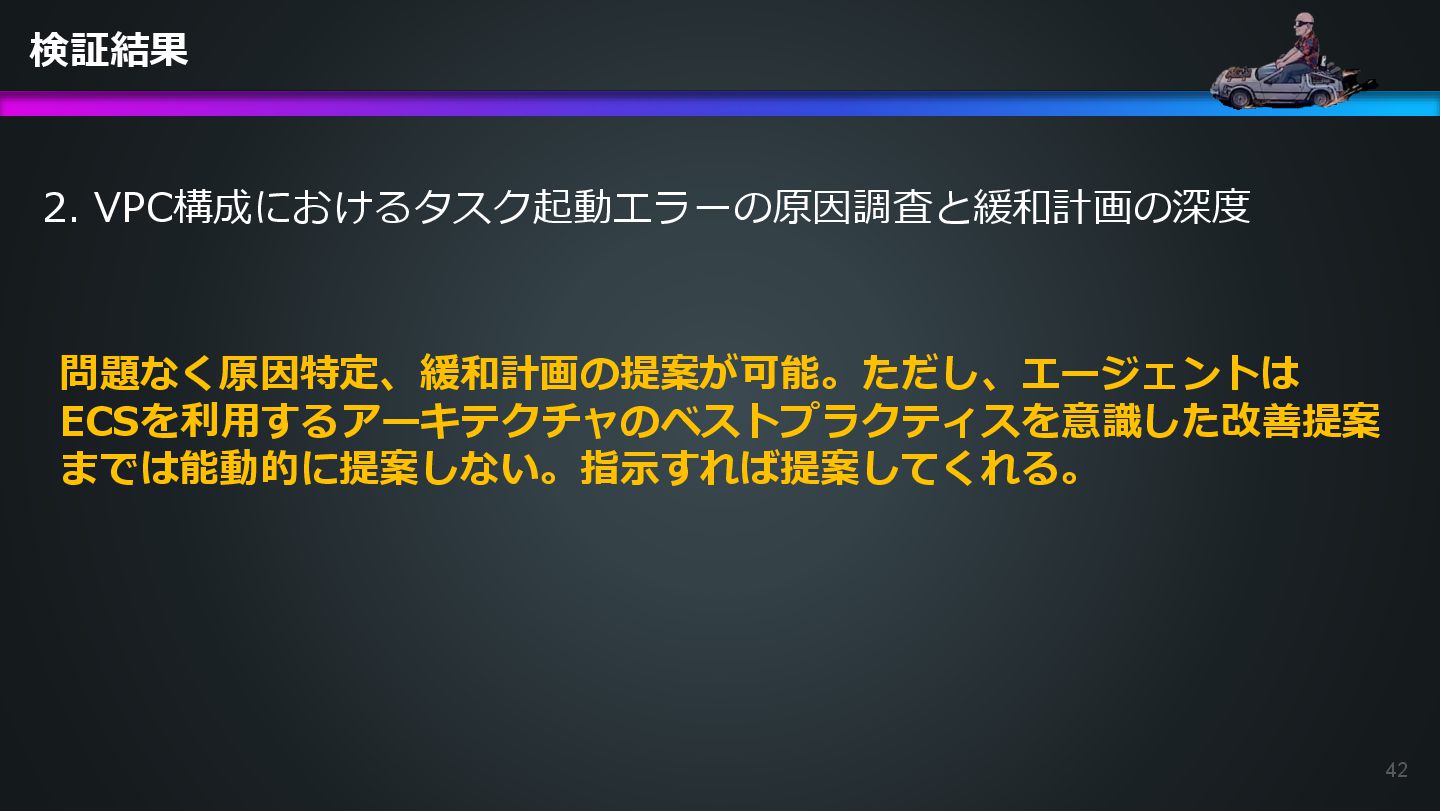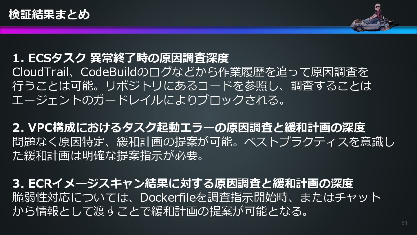 arn:aws:ecs:us-east-1:504301818838:task/ecs-healthcheck-lab- cluster/2d28dc1047c24cb98a942b30b8c06d10 has failed. Please identify the root cause of this issue. DevOps Agentへの指示プロンプト ※前ページのタスクIDとプロンプトで指示しているタスクIDが異なるが、 タスクID 2d28dc1047c24cb98a942b30b8c06d10 でも同事象が発生しているため検証内容に問題はない 日本語訳: ECSタスク arn:aws:ecs:AWSアカウントID:task/ecs-healthcheck-lab- cluster/2d28dc1047c24cb98a942b30b8c06d10のデプロイに失敗しています。 を特定してください。