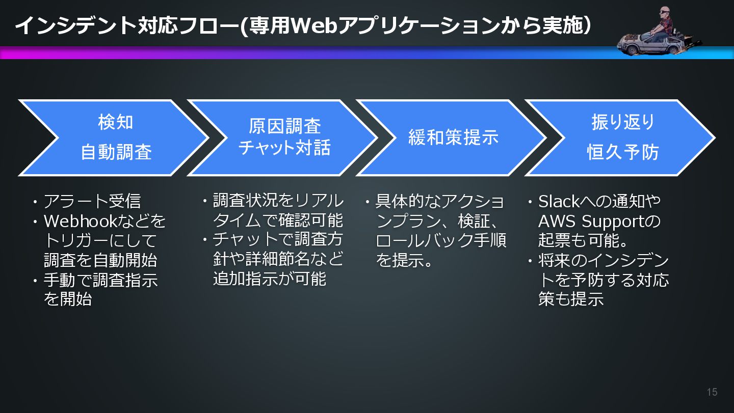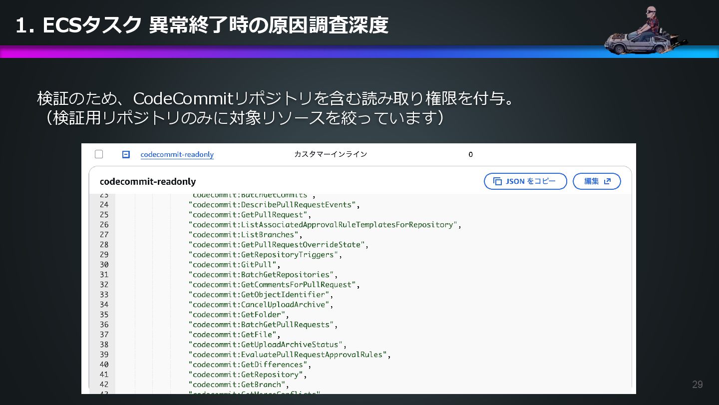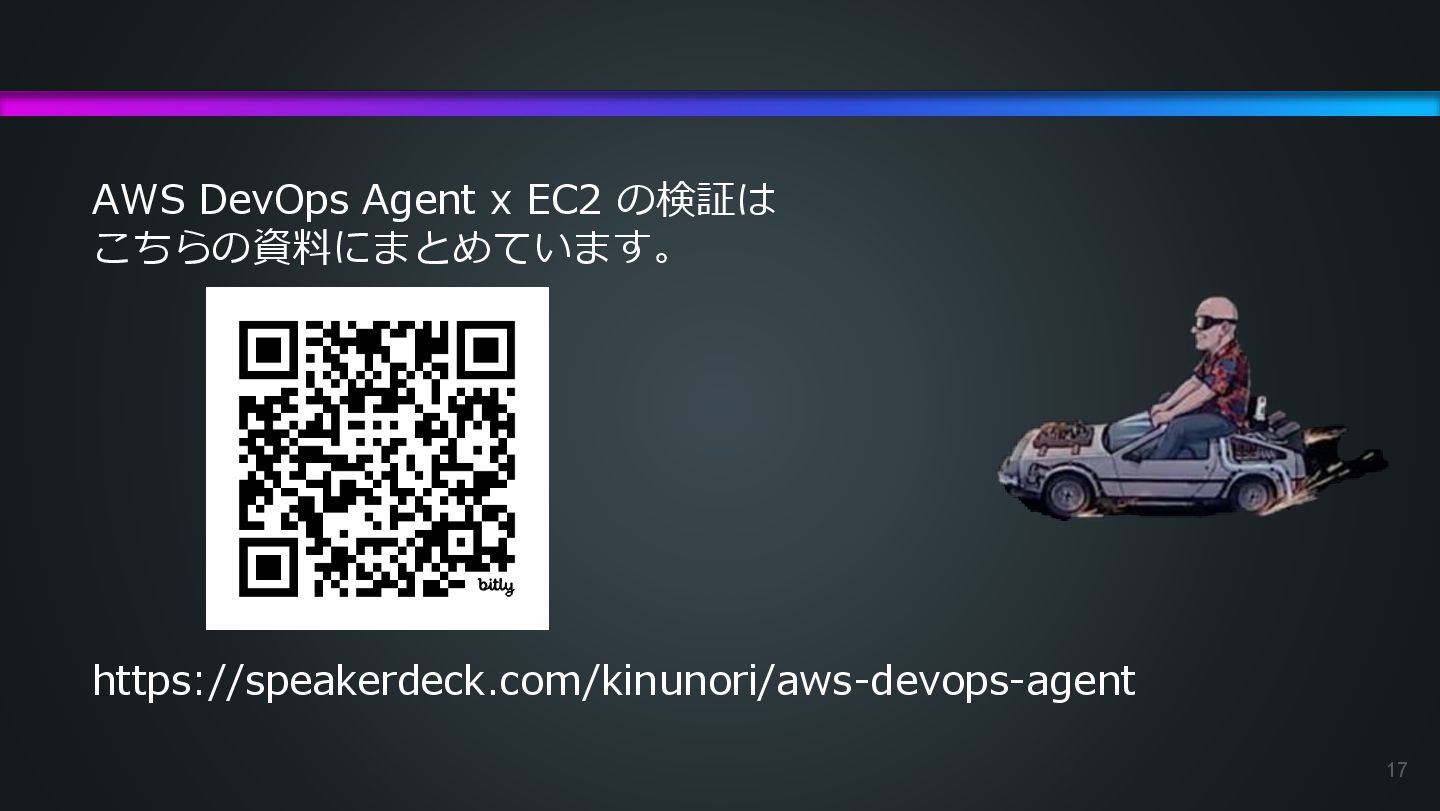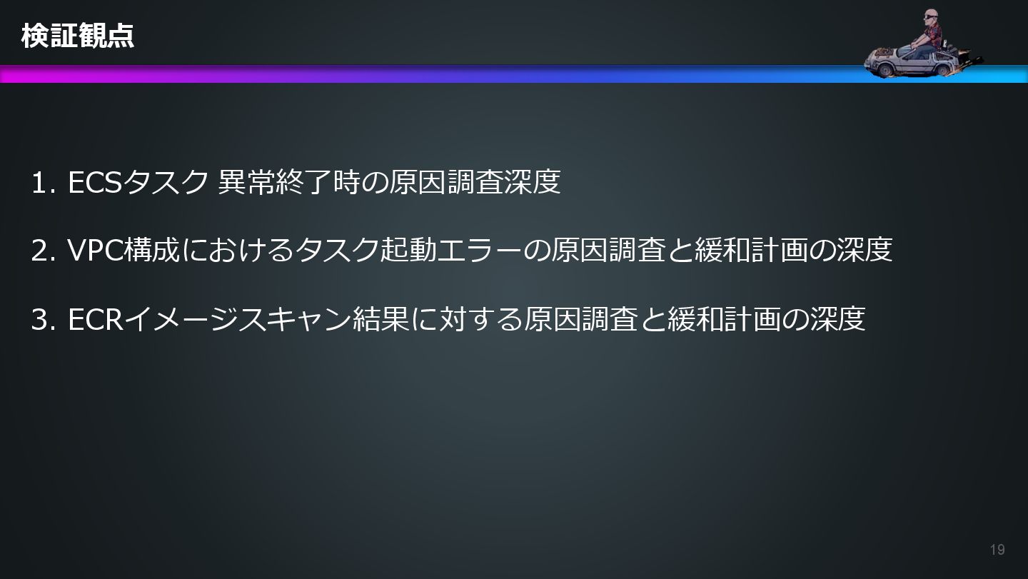 arn:aws:ecs:us-east-1:504301818838:task/ecs-healthcheck-lab- cluster/2d28dc1047c24cb98a942b30b8c06d10 has failed. Please identify the root cause of this issue. DevOps Agentへの指示プロンプト ※前ページのタスクIDとプロンプトで指示しているタスクIDが異なるが、 タスクID 2d28dc1047c24cb98a942b30b8c06d10 でも同事象が発生しているため検証内容に問題はない 日本語訳: ECSタスク arn:aws:ecs:AWSアカウントID:task/ecs-healthcheck-lab- cluster/2d28dc1047c24cb98a942b30b8c06d10のデプロイに失敗しています。 を特定してください。