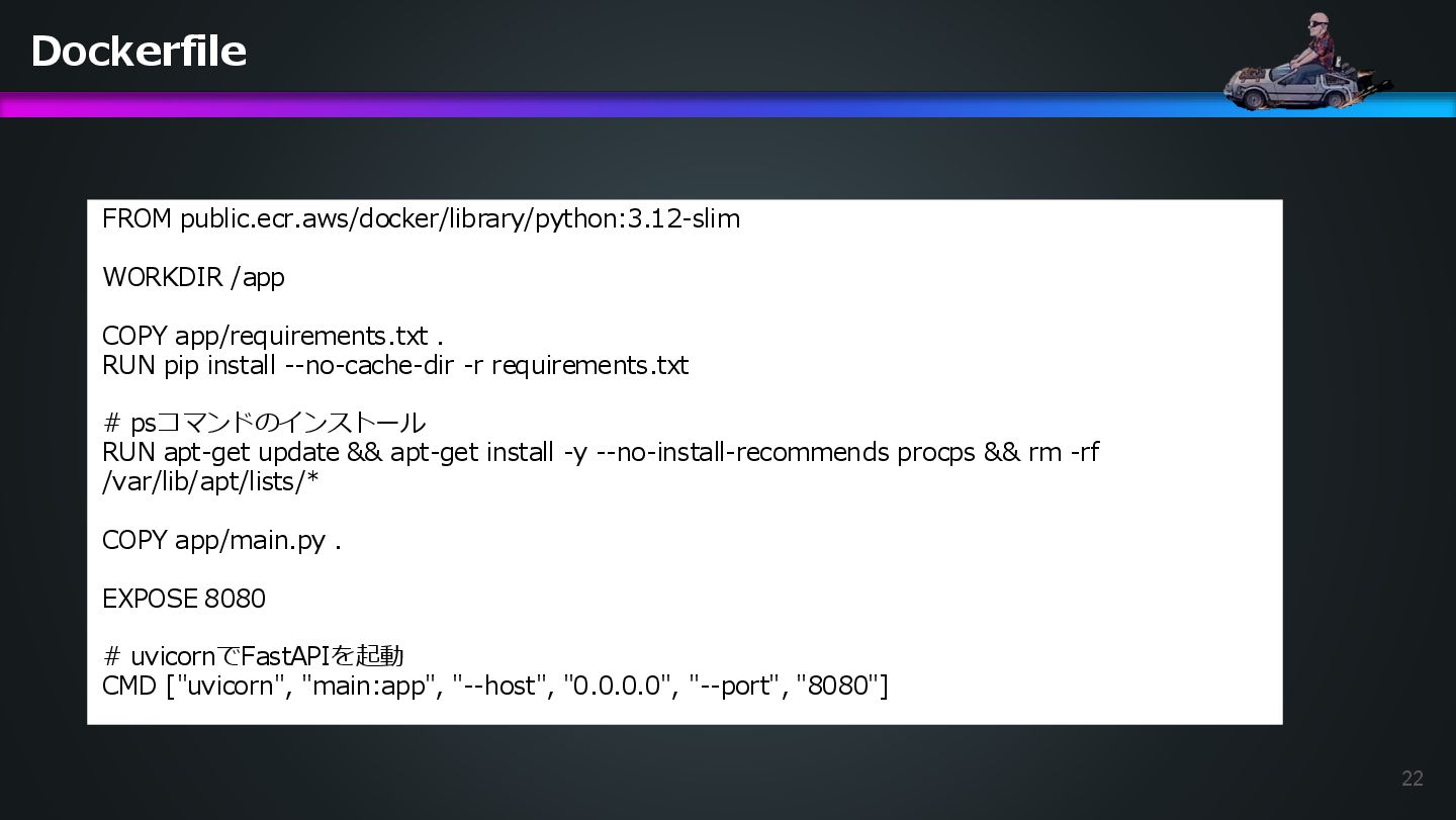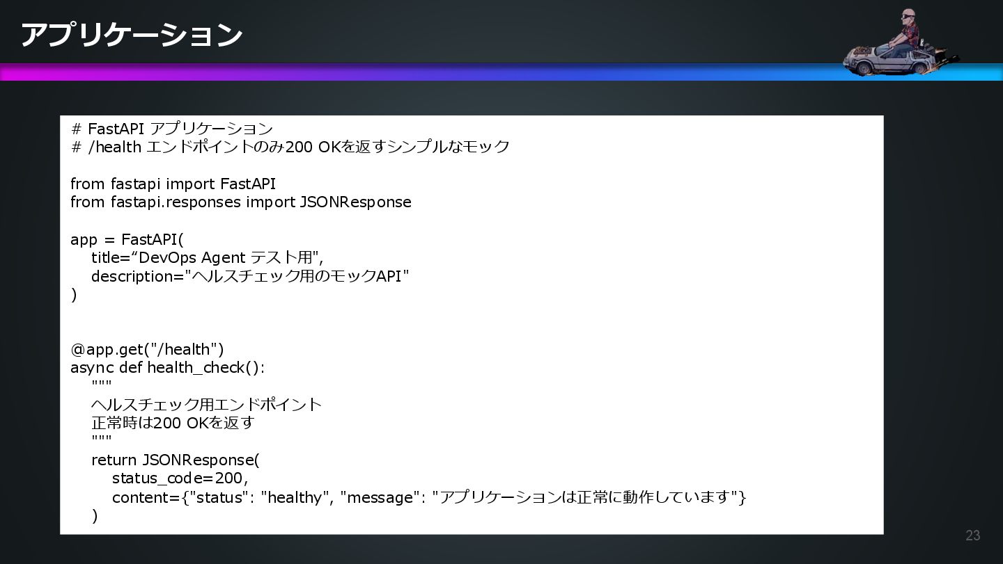 the application code and the exact line number where the relevant code is written, in order to clearly indicate that the application container does not expose a health check endpoint. アプリケーションコードとヘルスチェックの矛盾を特定させるべく追加指示を行う。 DevOps Agentへチェットで追加指示を実行。 日本語訳: アプリケーション コンテナーがヘルス チェック エンドポイントを公開しないことを明確に示すために、 アプリケーション コードを含むファイル名と、関連するコードが記述されている正確な行番号を指定し てください。