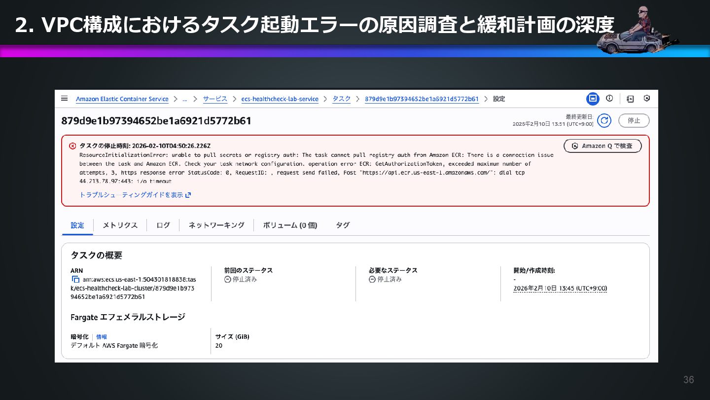 cluster/879d9e1b97394652be1a6921d5772b61 has failed. Please identify the root cause of this issue. DevOps Agentへの指示プロンプト 日本語訳: ECSタスク arn:aws:ecs:us-east-1:AWSアカウントID:task/ecs-healthcheck-lab- cluster/879d9e1b97394652be1a6921d5772b61のデプロイに失敗しています。原因を特定してくだ さい。