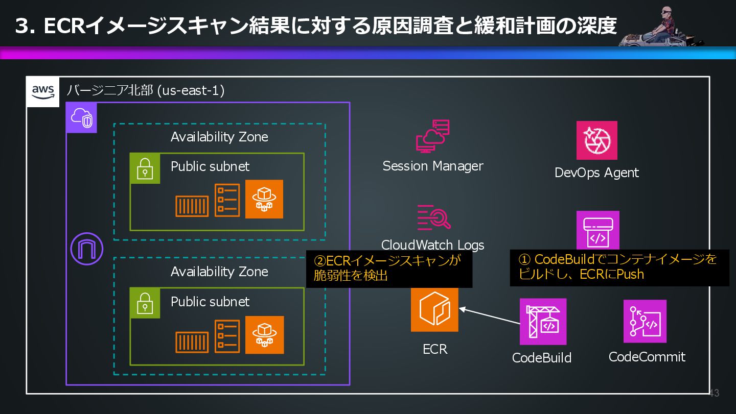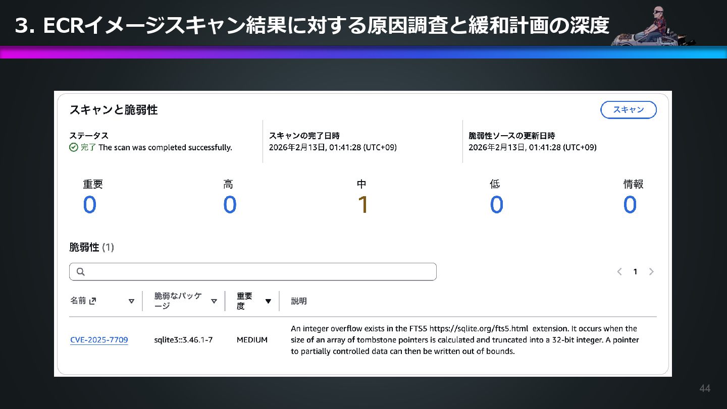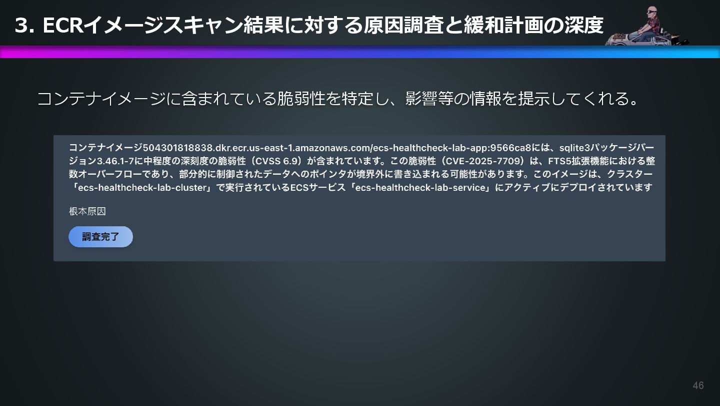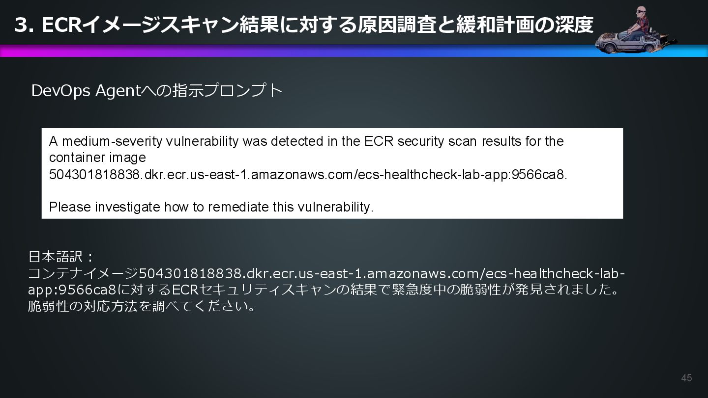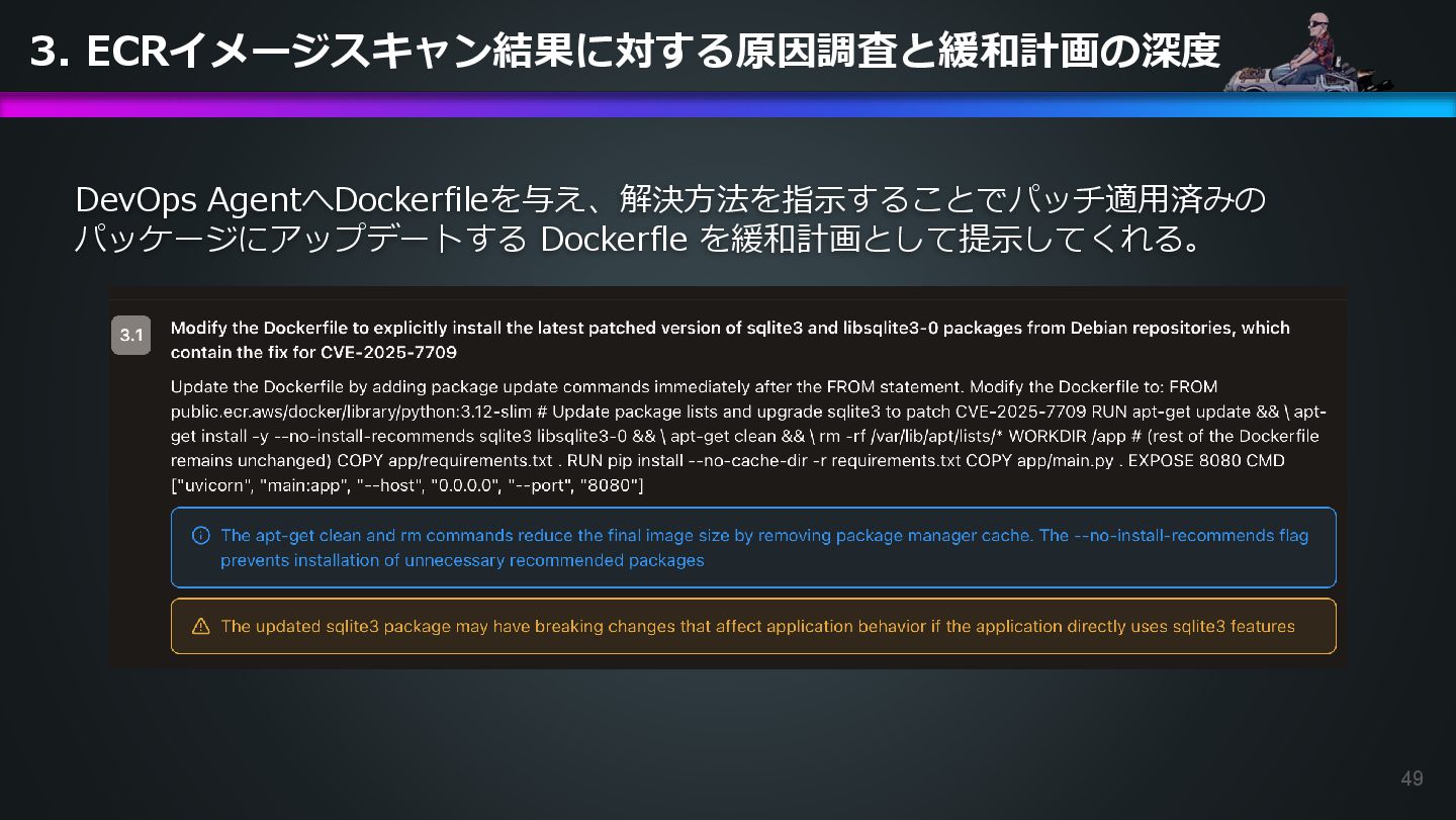 ECR security scan results for the container image 504301818838.dkr.ecr.us-east-1.amazonaws.com/ecs-healthcheck-lab-app:9566ca8. Please investigate how to remediate this vulnerability. DevOps Agentへの指示プロンプト 日本語訳: コンテナイメージ504301818838.dkr.ecr.us-east-1.amazonaws.com/ecs-healthcheck-lab- app:9566ca8に対するECRセキュリティスキャンの結果で緊急度中の脆弱性が発見されました。 脆弱性の対応方法を調べてください。