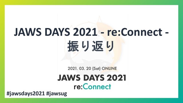 セッションの日本後同時通訳配信 用の環境設計、オペレーションを実現、JAWS DAYS 2021 を これまでの コミュニティオンラインイベントから1つ上のレベルに昇華させました。 Amazon Web Service Japan のコミュニティプログラムマネージャという立場で あるとはいえ、JAWS DAYS 2021 実行委員を手厚くサポートしていただき、 オンラインのJAWS DAYS を初めて企画する実行委員が、今回のイベント開催を 成功できたのは沼口さんの協力があったからだと感じています。 JAWS DAYS 2021 実行委員一同から感謝の気持ちをお送りしたいと思います!