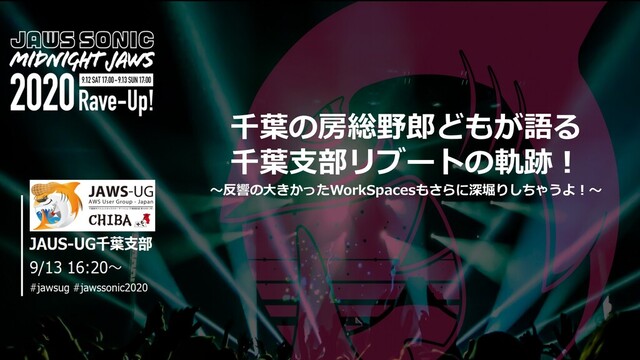 3⽉【中⽌】JAWS-UG さいたま&千葉 共同 〜re:Invent 2019 re:Cap さいたま vs 千葉 LTバトル 2020年 4⽉ ハンズオン<(オンライン) JAWS-UG 初⼼者⽀部&千葉⽀部 共同オンラインハンズオン 2020年 5⽉ JAWS-UG千葉⽀部 オンライン #1 Amazon WorkSpaces 勉強会 2020年 5⽉ JAWS-UG千葉⽀部 オンライン #2 AWS体験ハンズオン 2020年 5⽉ JAWS-UG千葉⽀部 オンライン #3 Onlineもくもく会 2020年 6⽉ JAWS-UG千葉⽀部オンライン#4⾦沢・初⼼者⽀部合同Amazon WorkSpacesハンズオン 2020年 7⽉ JAWS-UG千葉⽀部オンライン#5 初⼼者⽀部合同 Amazon QuickSight ML Insights 2020年 8⽉ JAWS-UG千葉⽀部オンライン#6 サーバレスで⾏うはじめての⾃然⾔語処理ハンズオン (予定) 2020年 9⽉ 16⽇ AWS Expert Online #11 / JAWS-UG千葉⽀部オンライン JAWS-UG 千葉⽀部 リブート後の活動履歴