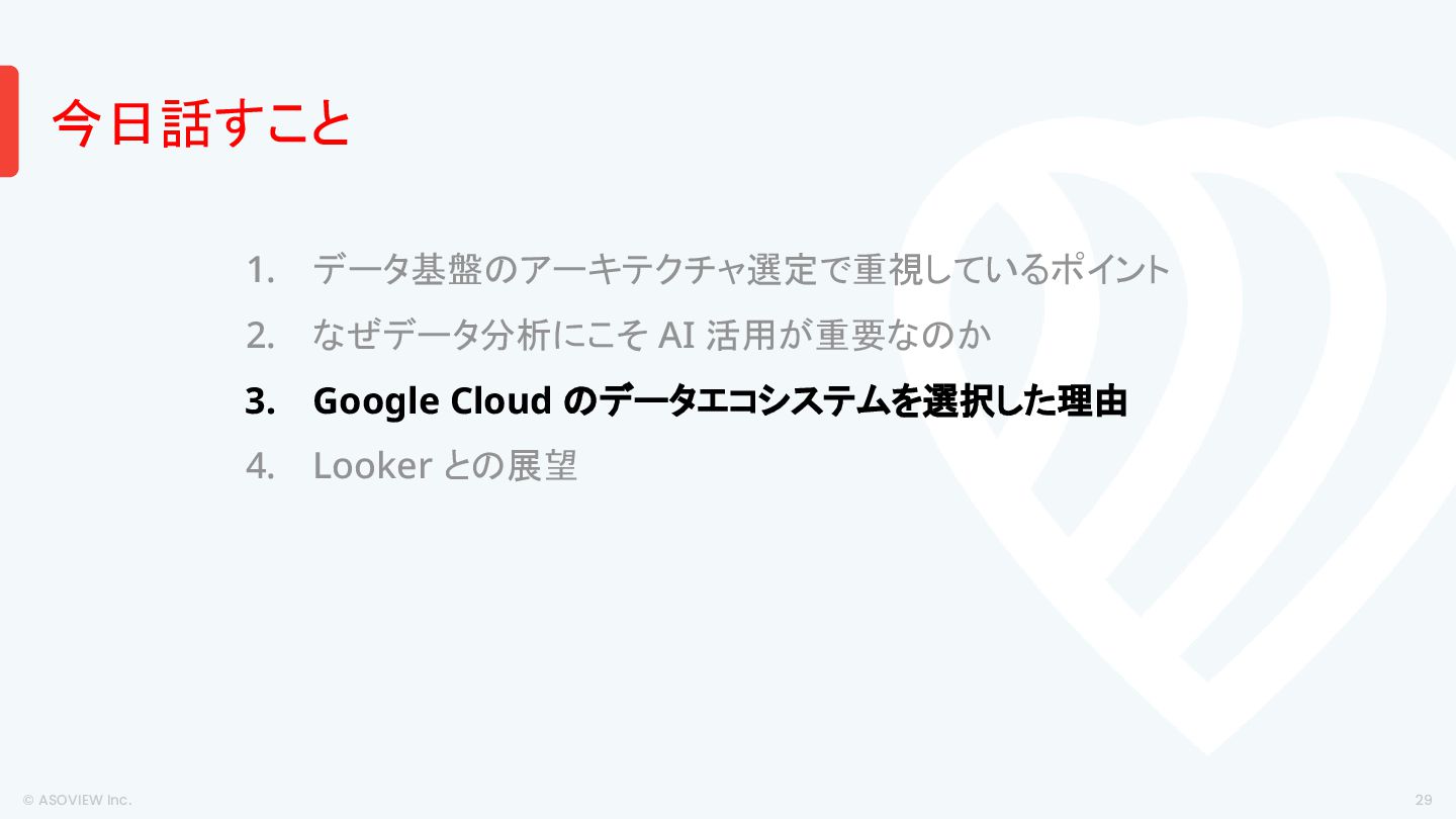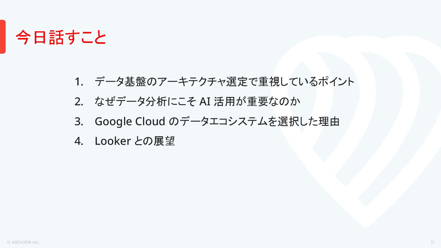 この課題を解決し、データ基盤の介在価値をより高めるために BigQuery + Looker を軸とした Google のデータ エコシステム全体を活用する方針 を決めたアソビュー。その背景や今後の展望をお話します。
