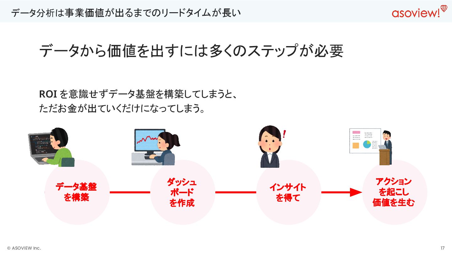 14. © ASOVIEW Inc. 17 データから価値を出すには多くのステップが必要