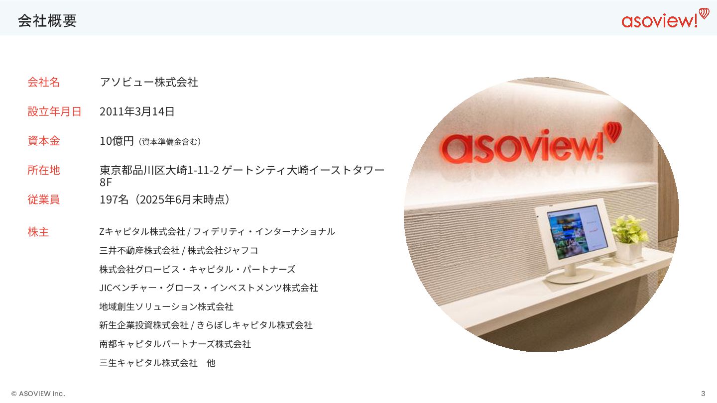 2. © ASOVIEW Inc. 3 会社名 アソビュー株式会社 設⽴年⽉⽇ 2011年3⽉14⽇ 10億円(資本準備⾦含む) 資本⾦
