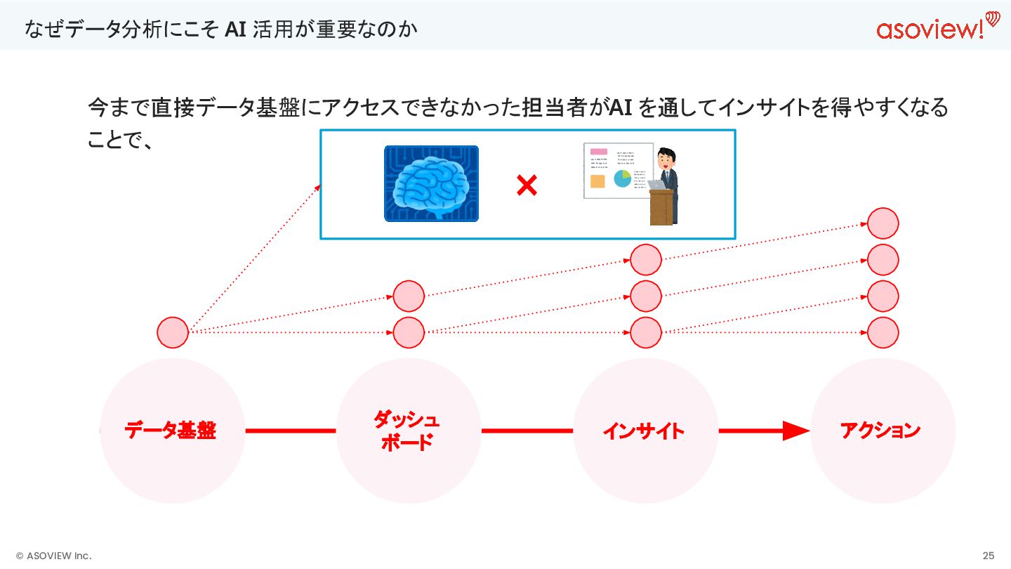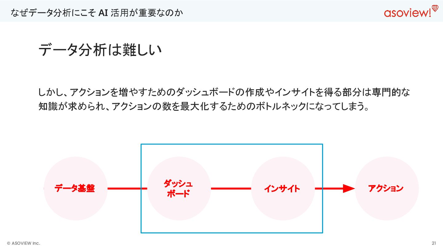 アソビューでは社内の AI 活用は進む一方で、データ活用そのものに AI が使えていない課題がありました。