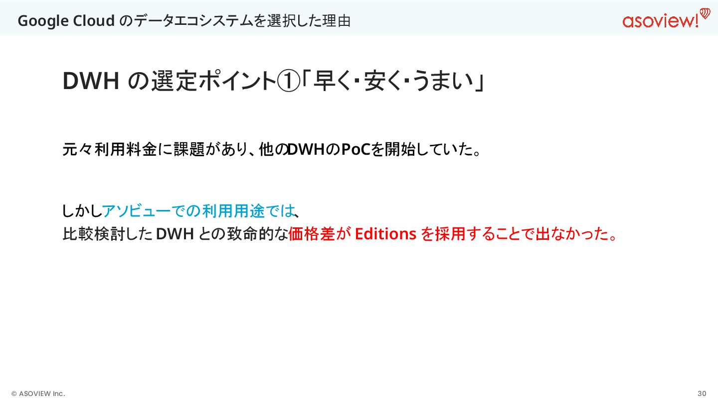 20. © ASOVIEW Inc. 30 DWH の選定ポイント①「早く・安く・うまい」