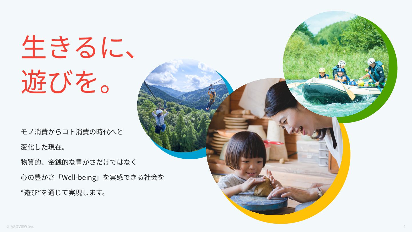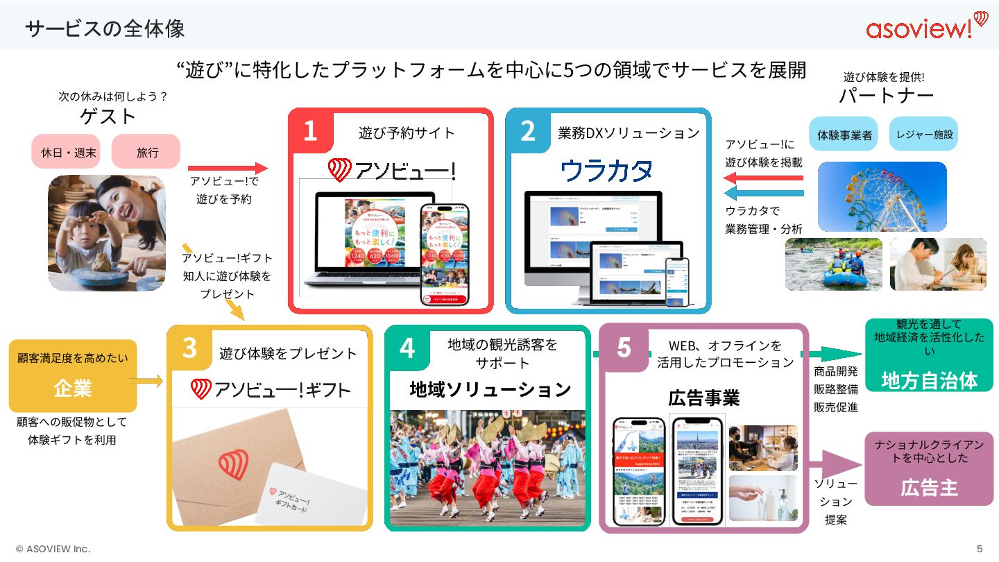 3. © ASOVIEW Inc. 5 “遊び”に特化したプラットフォームを中⼼に5つの領域でサービスを展開 地域の観光誘客を サポート 地域ソリューション 遊び体験をプレゼント 業務DXソリューション