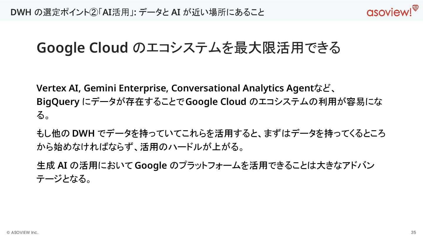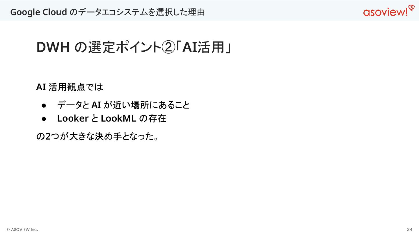 23. © ASOVIEW Inc. 34 DWH の選定ポイント②「AI活用」