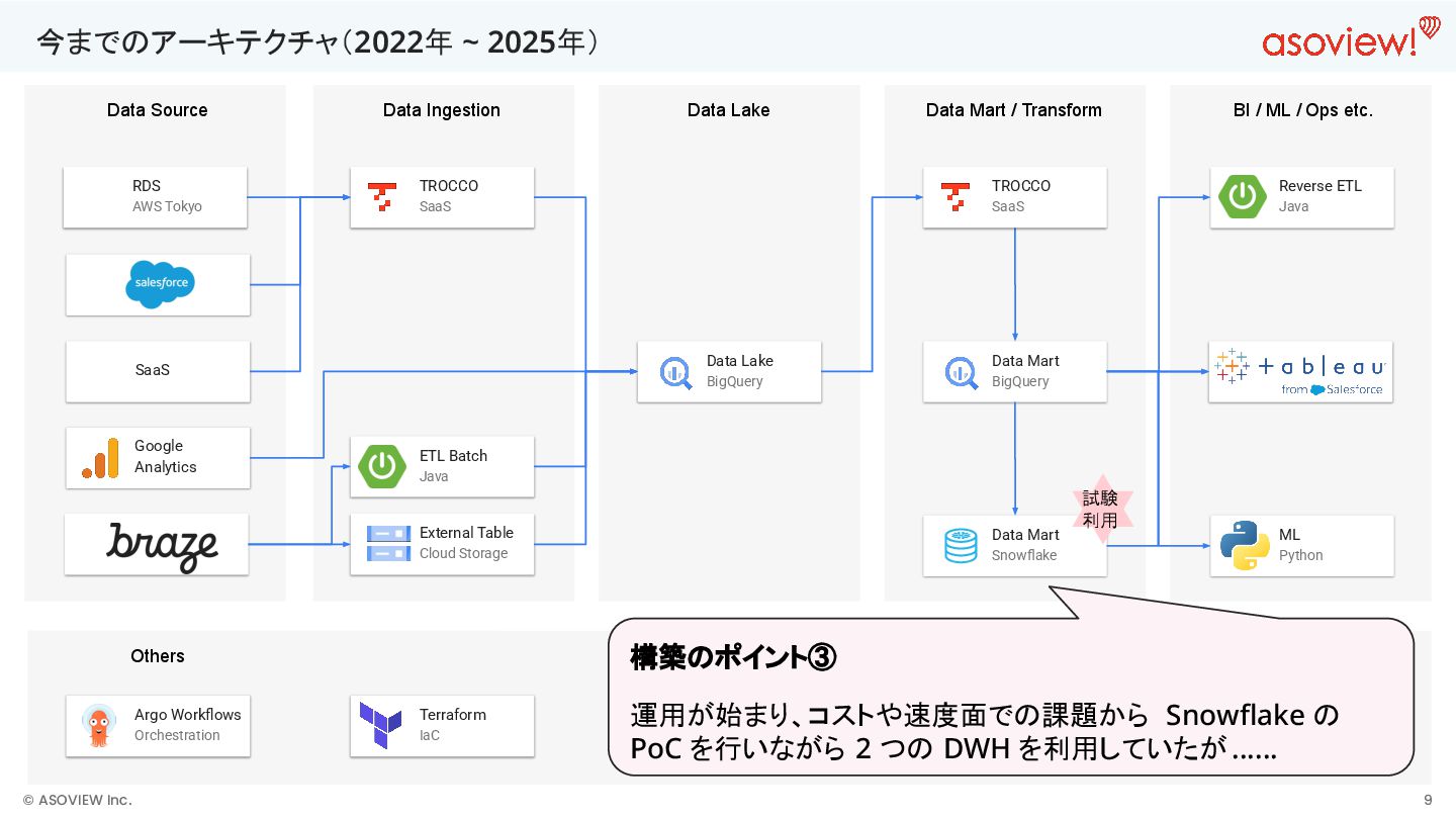 Ingestion Data Lake Data Mart / Transform BI / ML / Ops etc. Data Mart Snowflake External Table Cloud Storage RDS AWS Tokyo Data Lake BigQuery Google Analytics SaaS TROCCO SaaS Data Mart BigQuery 試験 利用 Argo Workflows Orchestration ETL Batch Java TROCCO SaaS Reverse ETL Java Terraform IaC Others ML Python 構築のポイント②