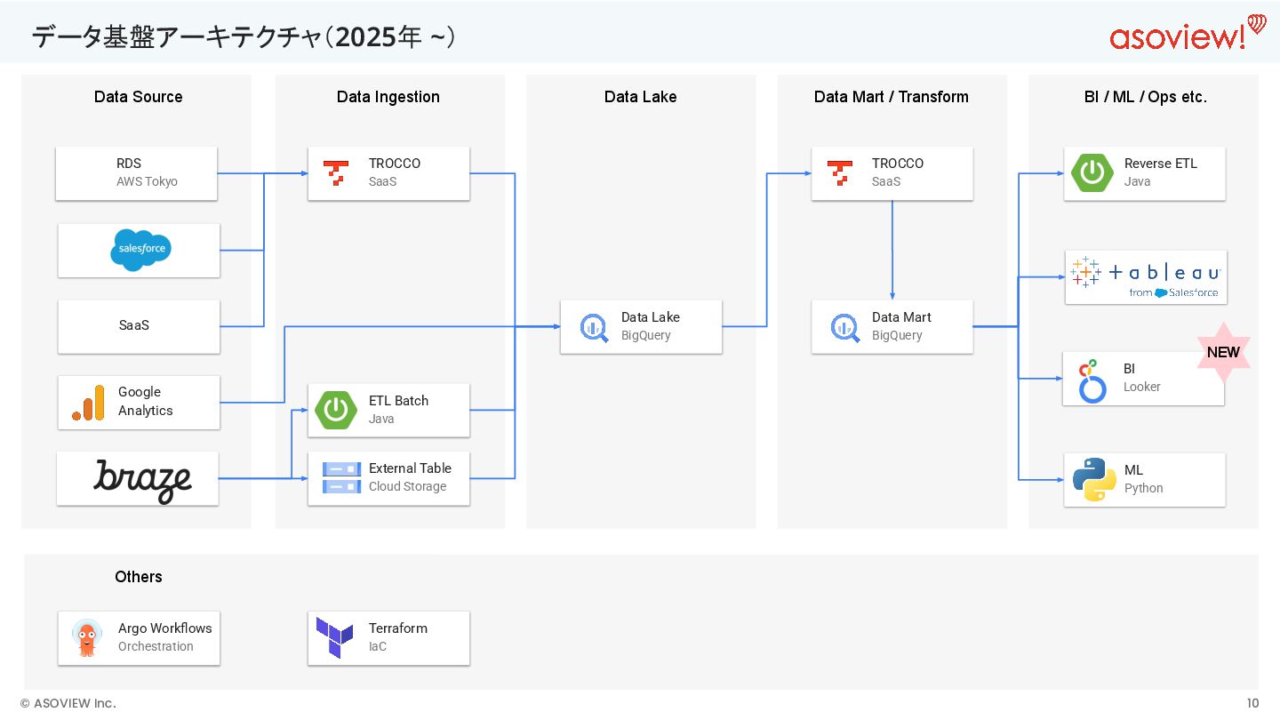 Data Lake Data Mart / Transform BI / ML / Ops etc. External Table Cloud Storage RDS AWS Tokyo Data Lake BigQuery Google Analytics SaaS TROCCO SaaS Data Mart BigQuery Argo Workflows Orchestration ETL Batch Java TROCCO SaaS Reverse ETL Java Terraform IaC Others ML Python BI Looker NEW