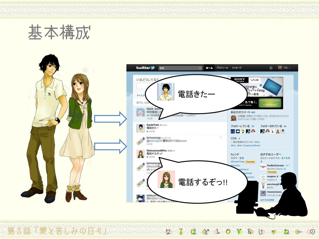 @〜 ちゃん今日サークル来る?? おっ珍しく起きてんじゃん。w おはよっ(*^v^)/あ、今日お昼ごはん一 緒に食べない??☆ 昼社食行く?貸してって言われてた DVD持ってくよ! おはよう(ノ_-o)めっちゃ眠いんだけど… 笑 はよ^^今日サークル来る? やほー!! おはよー まじ眠いなー…w やっほー!!今日も寒いね(*>_<) おはよっ!レポート終わった? @〜 ちゃん今日バイト??みんなとカ ラオケ行くんだけど、来るー??(^^*) おはよ 今日の説明会行くの? おっす!昨日まじ楽しかったな!w このほか、「おやすみ」や文末の”?”「かわいいね/かっこいいね」等ほめ言葉 や「がんばれ」等の励まし、「うるさい/うざい」等の悪口にも反応します。 第3話「愛と苦しみの日々」