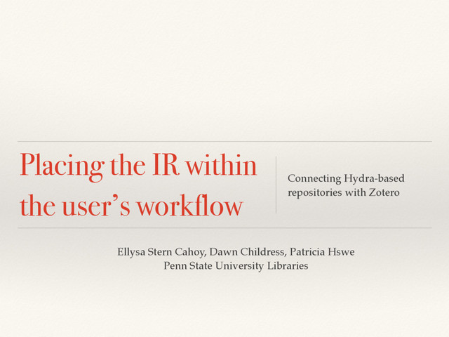 Hydra! ❖ ORCID, more cloud services ! Other kinds of workflow support! ❖ Mediated deposit! ❖ Deposit of multiple files for one item record! ❖ Large file deposits! For Hydra repos in general! ❖ UX, research data, improved understanding of collections and sets