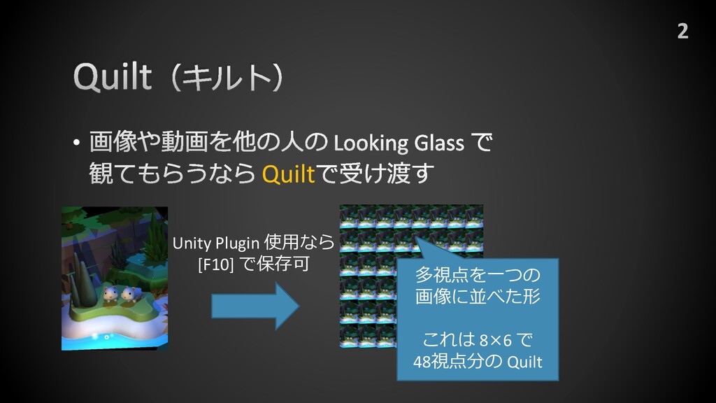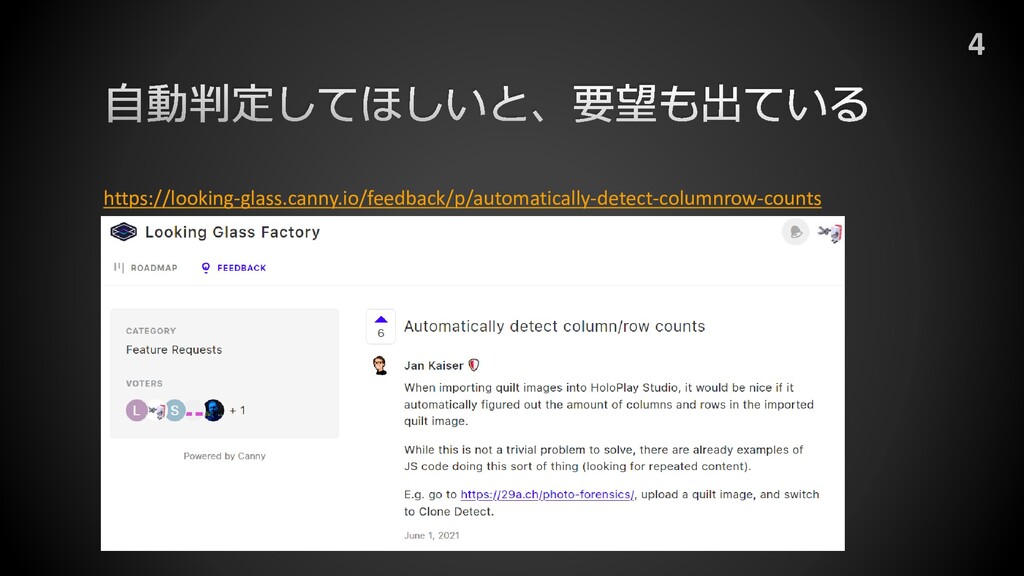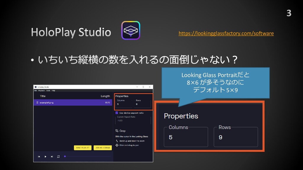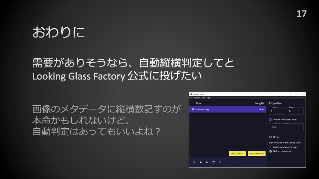 Looking Glass の Quilt の縦横数判定はそう難しくはないため、是非 HoloPlay Studio でも実装してほしいという内容です。