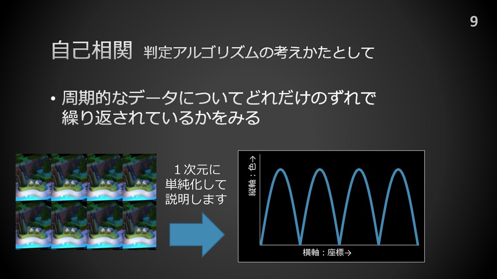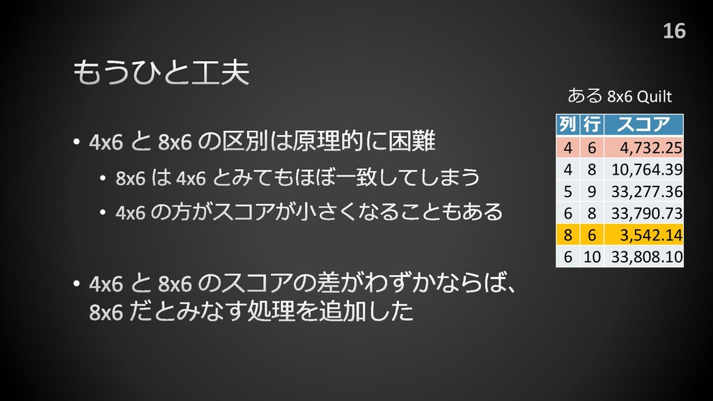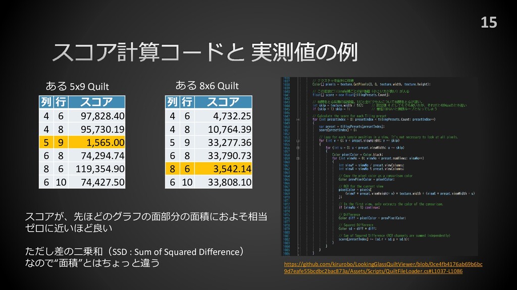 8 95,730.19 5 9 1,565.00 6 8 74,294.74 8 6 119,354.90 6 10 74,427.50 列 行 スコア 4 6 4,732.25 4 8 10,764.39 5 9 33,277.36 6 8 33,790.73 8 6 3,542.14 6 10 33,808.10 ある 5x9 Quilt ある 8x6 Quilt スコアが、先ほどのグラフの面部分の面積におよそ相当 ゼロに近いほど良い ただし差の二乗和(SSD : Sum of Squared Difference) なので“面積”とはちょっと違う