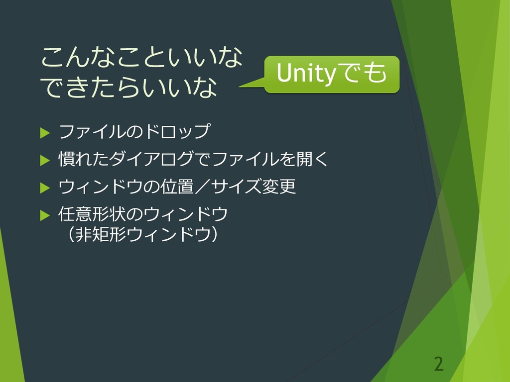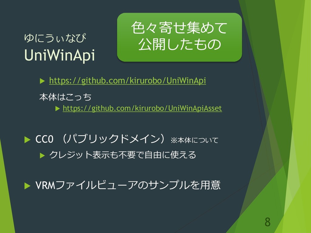 4. ゆにうぃなぴ UniWinApi  https://github.com/kirurobo/UniWinApi 本体はこっち  https://github.com/kirurobo/UniWinApiAsset  CC0 (パブリックドメイン)※本体について