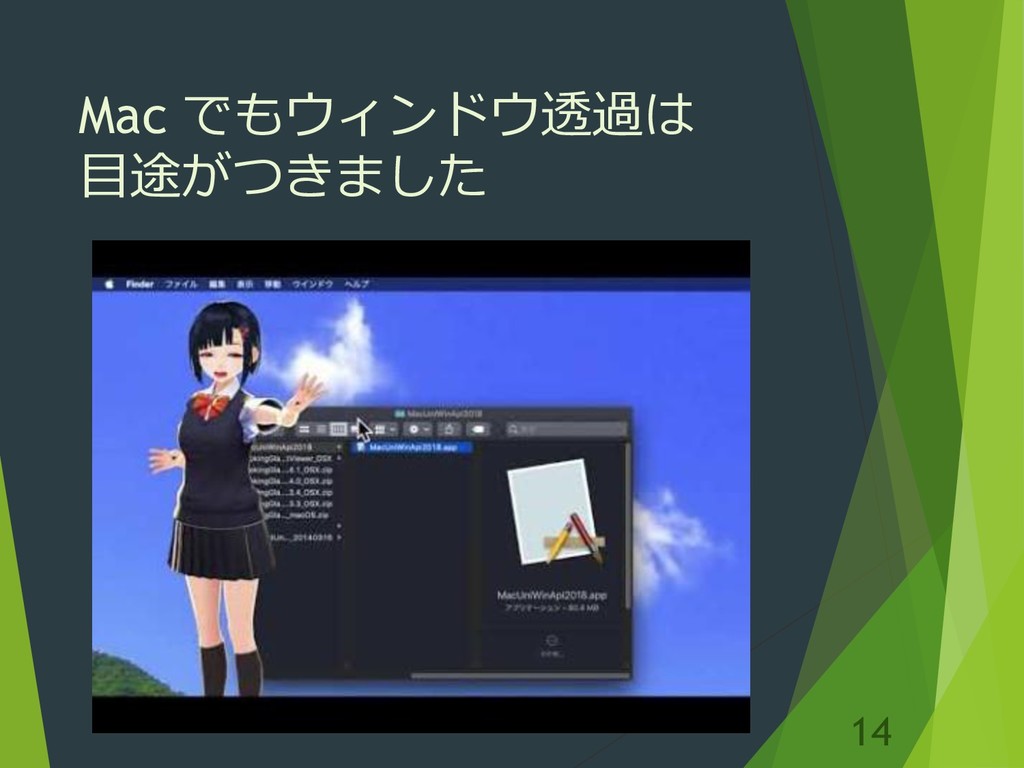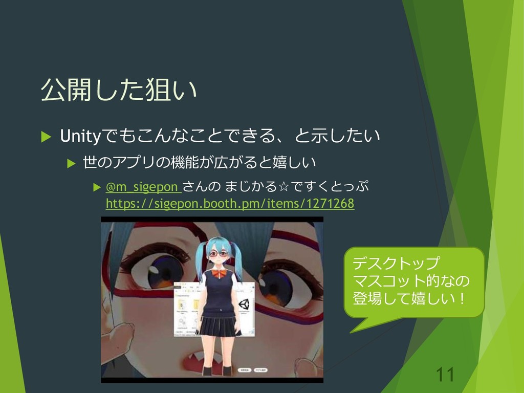 6. 公開した狙い  もっと良いライブラリを誰か作ってほしい  例 @satoya_123 さん Desktop Mascot Maker
