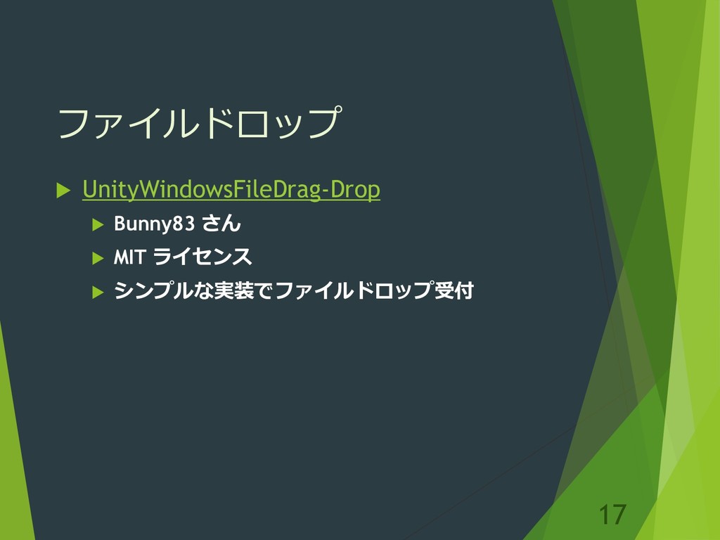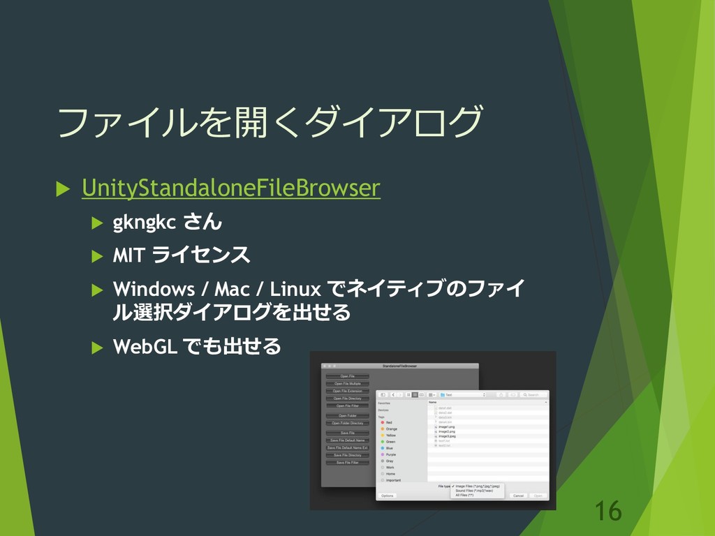 Windows / Mac / Linux でネイティブのファイ ル選択ダイアログを出せる  WebGL でも出せる 16