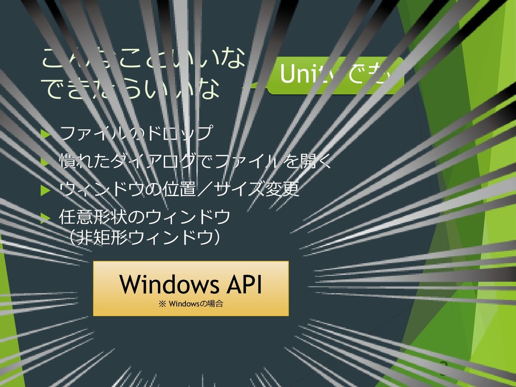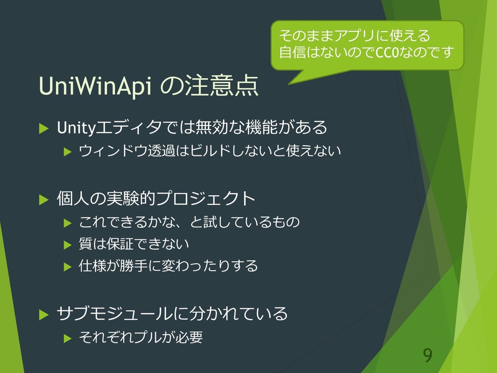 5. UniWinApi の注意点  Unityエディタでは無効な機能がある  ウィンドウ透過はビルドしないと使えない  個人の実験的プロジェクト  これできるかな、と試しているもの