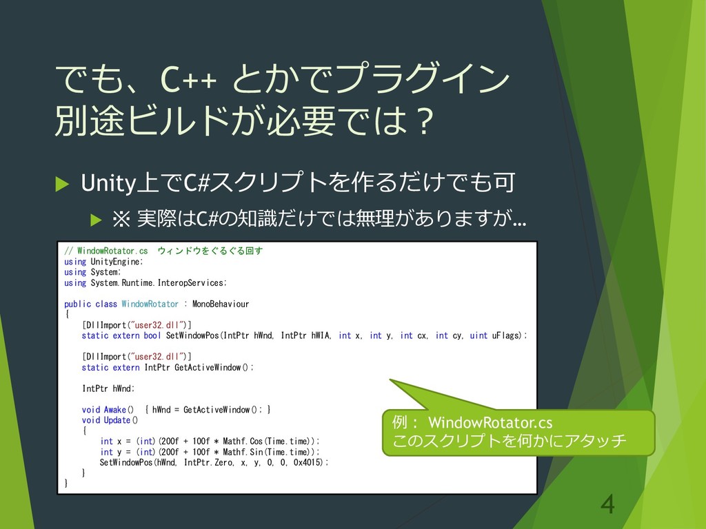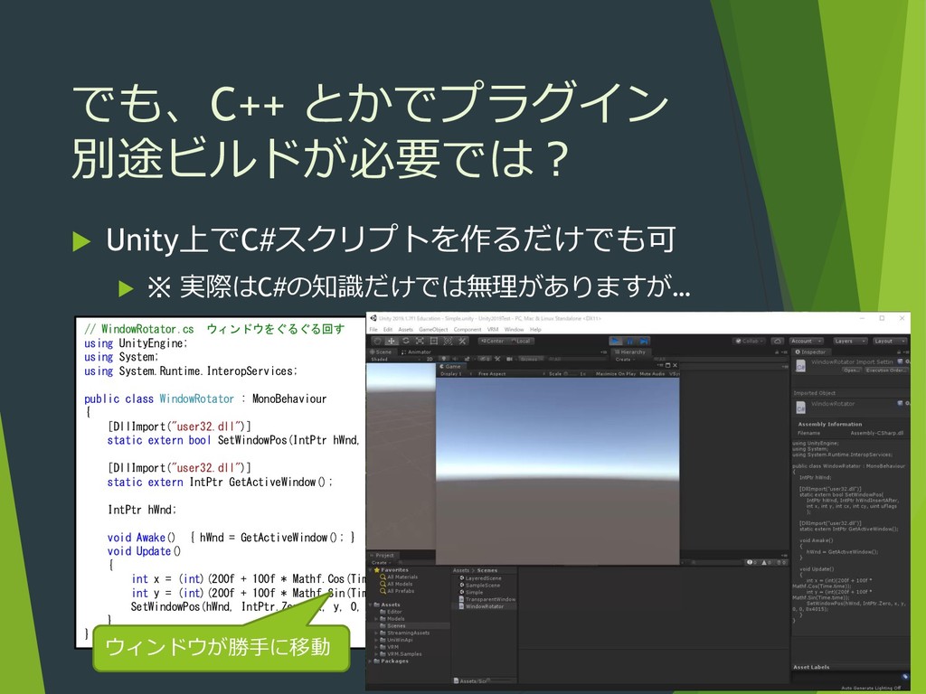 1. でも、C++ とかでプラグイン 別途ビルドが必要では?  Unity上でC#スクリプトを作るだけでも可  ※ 実際はC#の知識だけでは無理がありますが… 4 //
