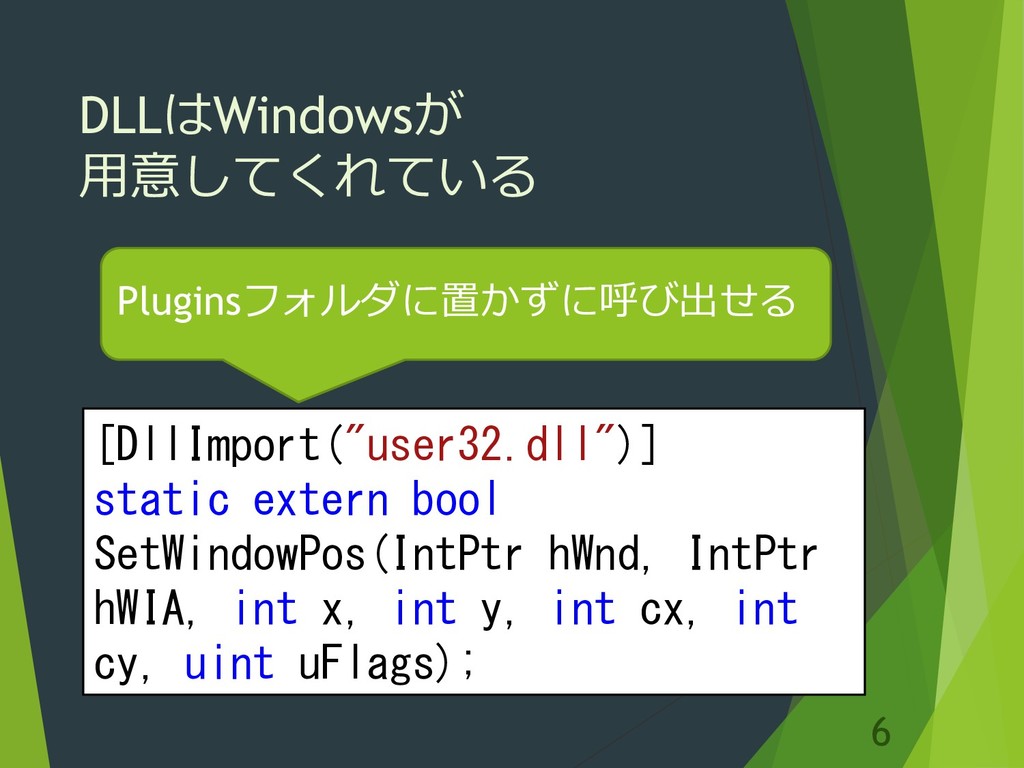 3. DLLはWindowsが 用意してくれている 6 [DllImport("user32.dll")] static extern bool SetWindowPos(IntPtr hWnd, IntPtr