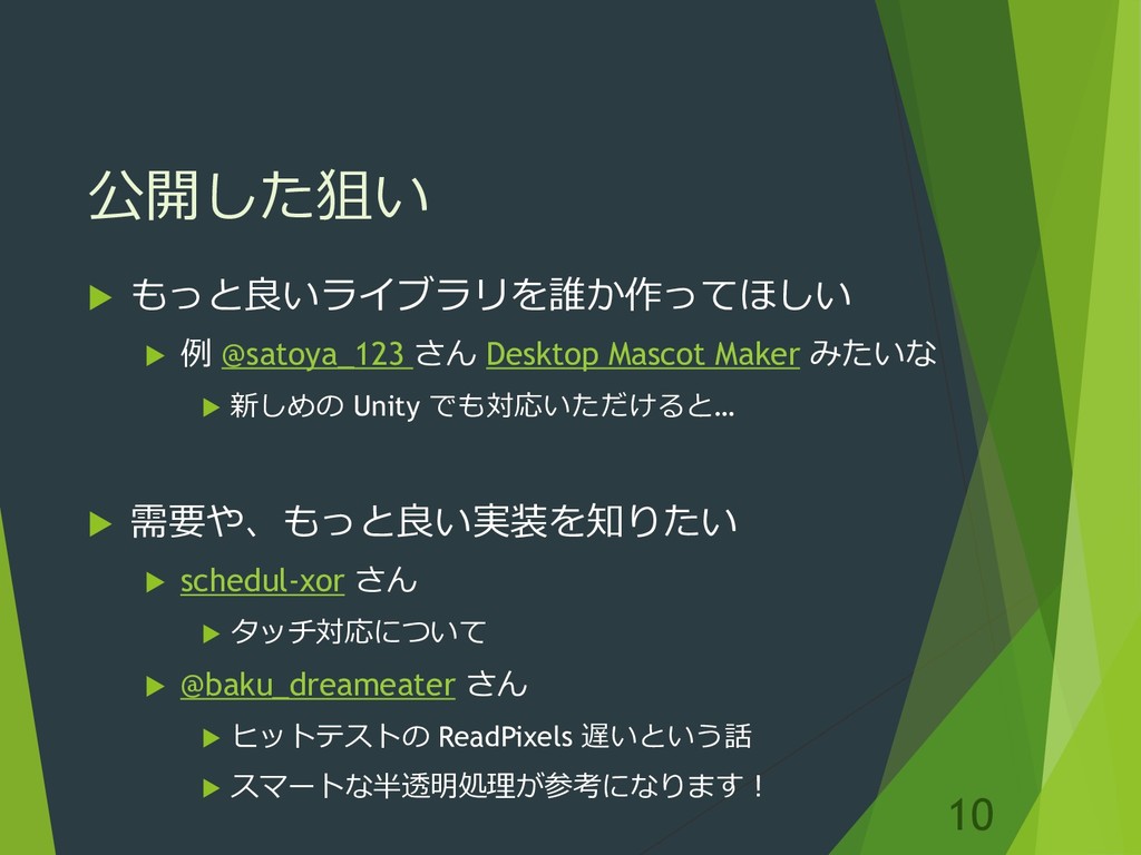みたいな  新しめの Unity でも対応いただけると…  需要や、もっと良い実装を知りたい  schedul-xor さん  タッチ対応について  @baku_dreameater さん  ヒットテストの ReadPixels 遅いという話  スマートな半透明処理が参考になります! 10