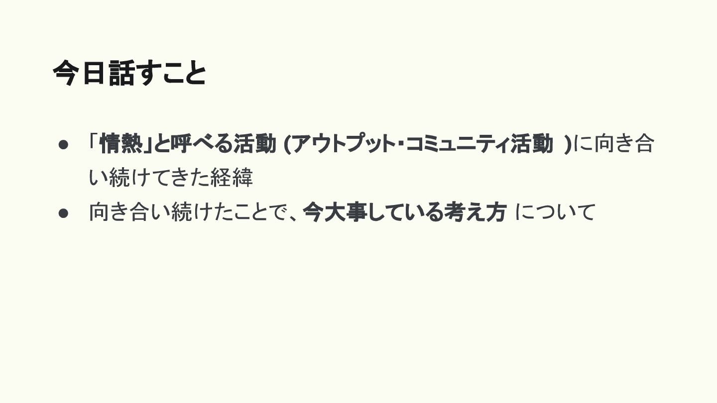 • 「情熱」と呼べる活動 (アウトプット・コミュニティ活動 )に向き合 い続けてきた経緯 • 向き合い続けたことで、今大事している考え方 について 今日話すこと