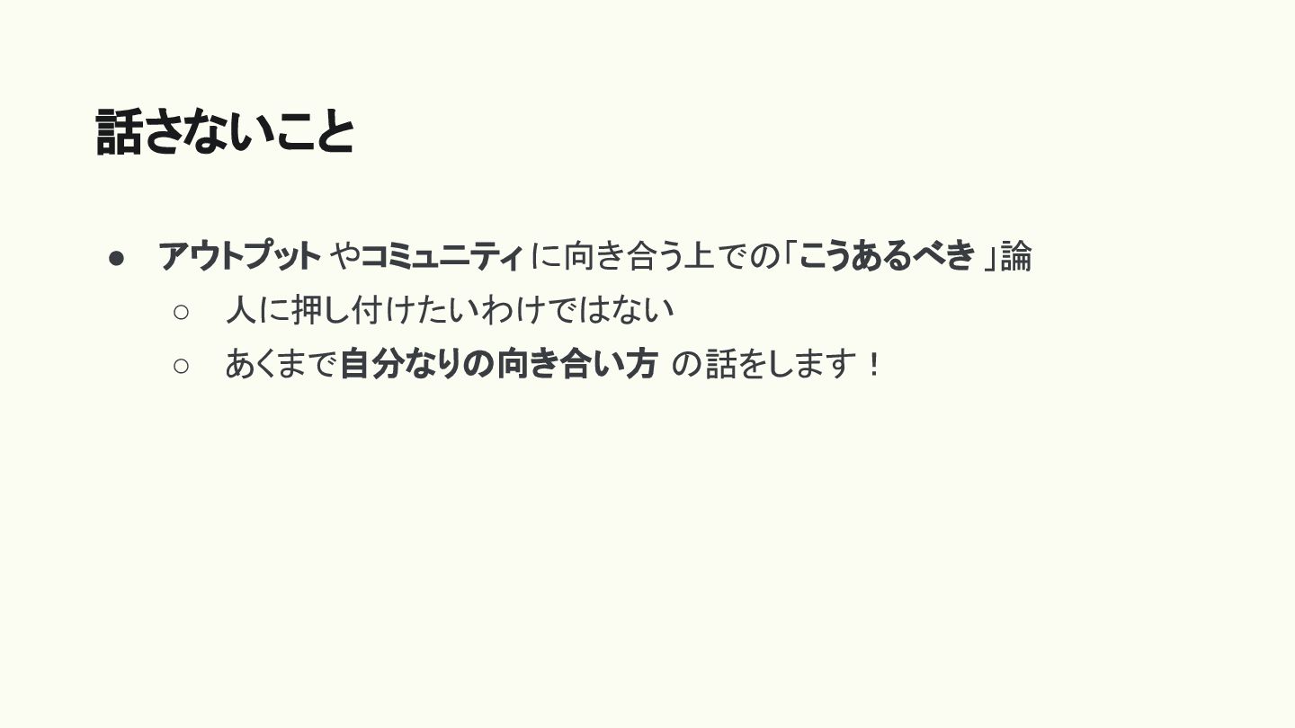• アウトプット やコミュニティ に向き合う上での「こうあるべき 」論 ◦ 人に押し付けたいわけではない ◦ あくまで自分なりの向き合い方 の話をします!