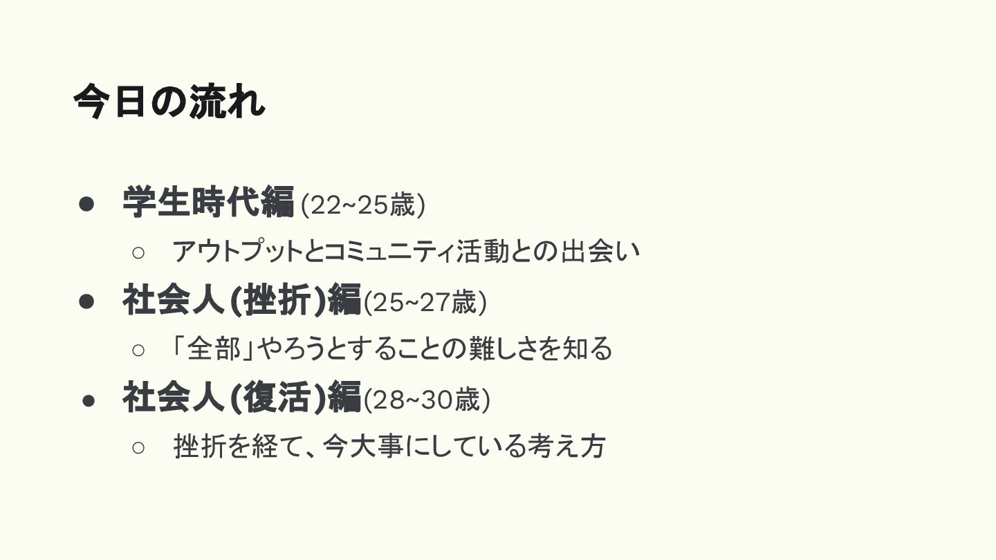 • 学生時代編 (22~25歳) ◦ アウトプットとコミュニティ活動との出会い • 社会人(挫折)編(25~27歳) ◦ 「全部」やろうとすることの難しさを知る •