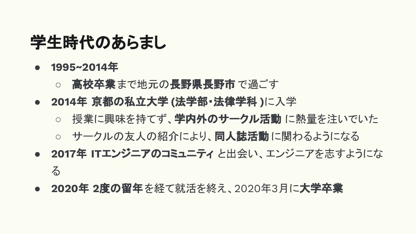 ◦ 授業に興味を持てず、学内外のサークル活動 に熱量を注いでいた ◦ サークルの友人の紹介により、同人誌活動 に関わるようになる • 2017年 ITエンジニアのコミュニティ と出会い、エンジニアを志すようにな る • 2020年 2度の留年を経て就活を終え、2020年3月に大学卒業 学生時代のあらまし