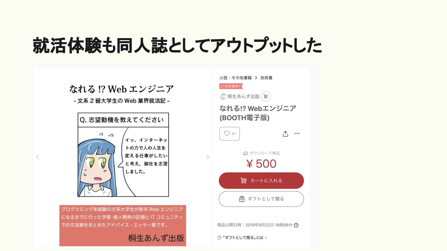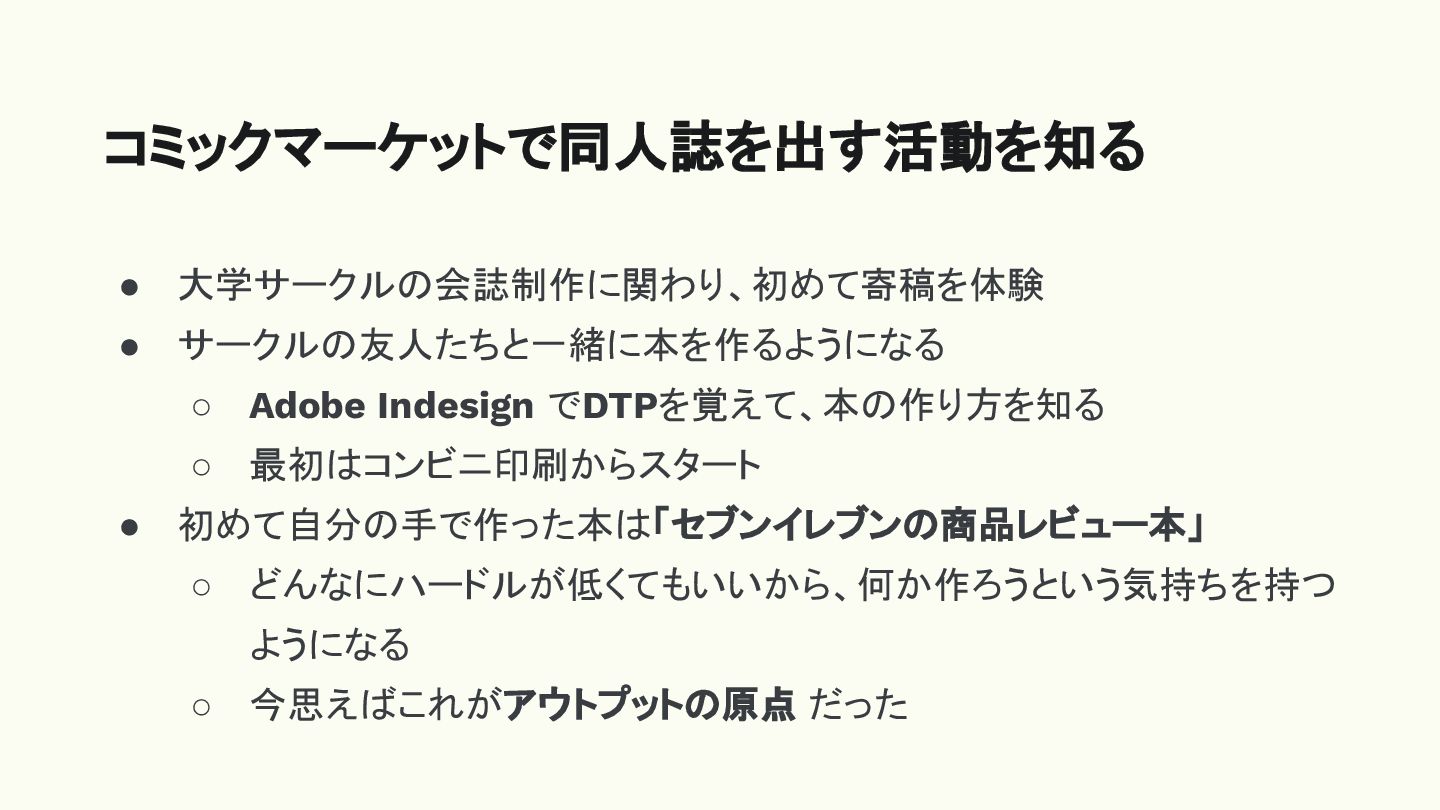 • 初めて自分の手で作った本は「セブンイレブンの商品レビュー本」 ◦ どんなにハードルが低くてもいいから、何か作ろうという気持ちを持つ ようになる ◦ 今思えばこれがアウトプットの原点 だった コミックマーケットで同人誌を出す活動を知る