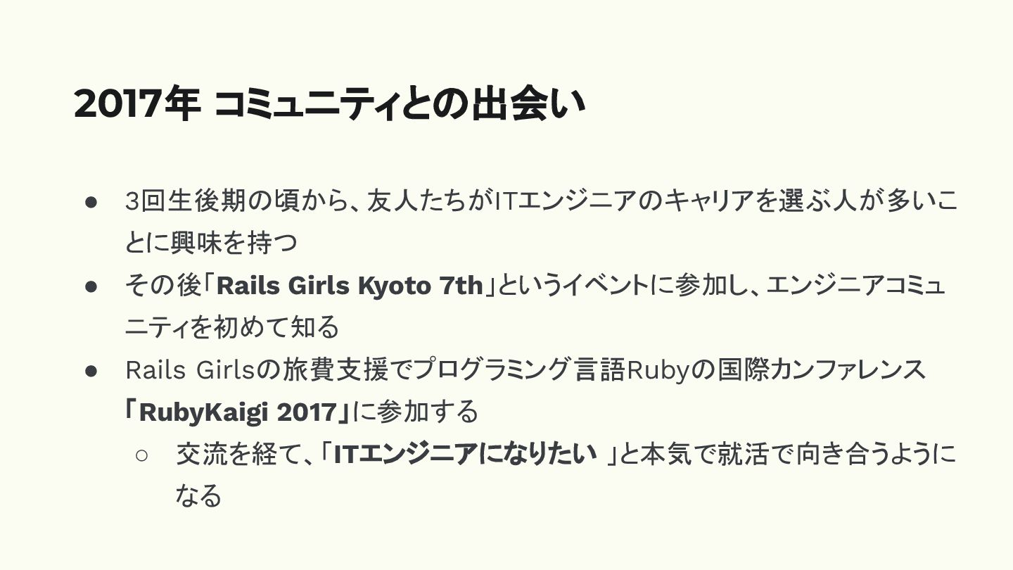 Rails Girlsの旅費支援でプログラミング言語Rubyの国際カンファレンス 「RubyKaigi 2017」に参加する ◦ 交流を経て、「ITエンジニアになりたい 」と本気で就活で向き合うように なる 2017年 コミュニティとの出会い