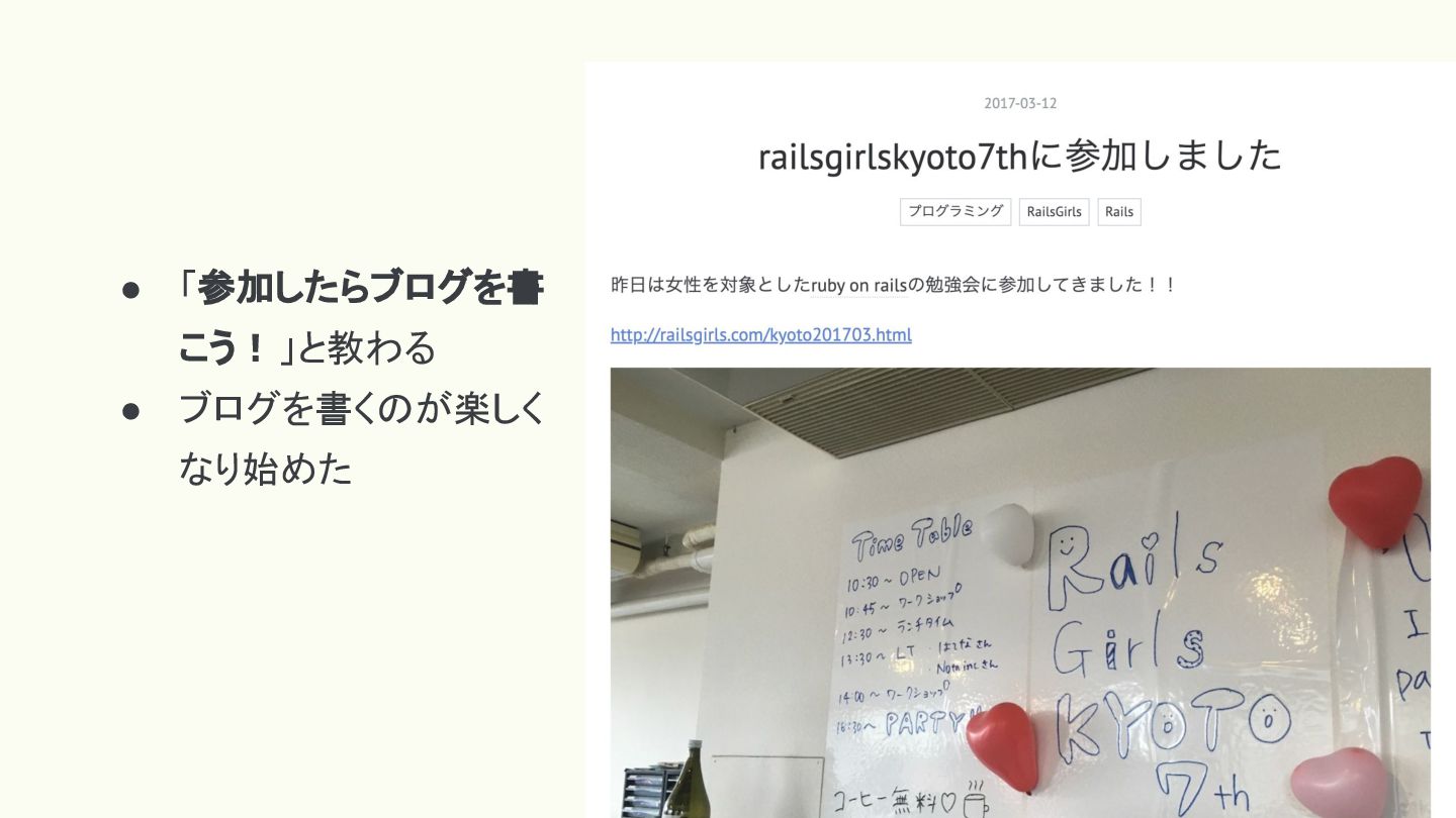 • 「参加したらブログを書 こう!」と教わる • ブログを書くのが楽しく なり始めた