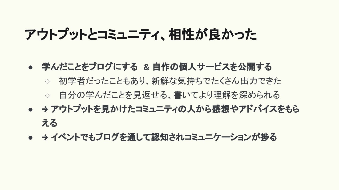 アウトプットを見かけたコミュニティの人から感想やアドバイスをもら える • → イベントでもブログを通して認知されコミュニケーションが捗る アウトプットとコミュニティ、相性が良かった