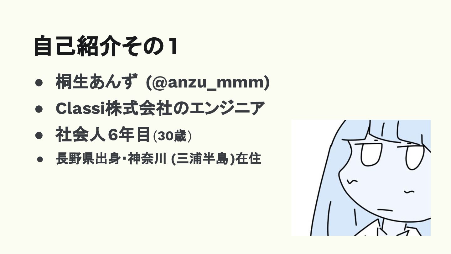 • 桐生あんず (@anzu_mmm) • Classi株式会社のエンジニア • 社会人6年目(30歳) • 長野県出身・神奈川 (三浦半島)在住