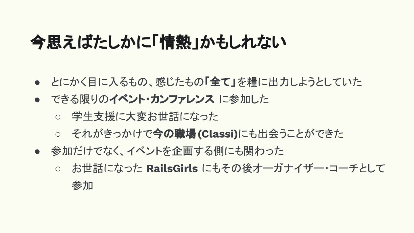 • とにかく目に入るもの、感じたもの「全て」を糧に出力しようとしていた • できる限りのイベント・カンファレンス に参加した ◦ 学生支援に大変お世話になった ◦ それがきっかけで今の職場(Classi)にも出会うことができた •