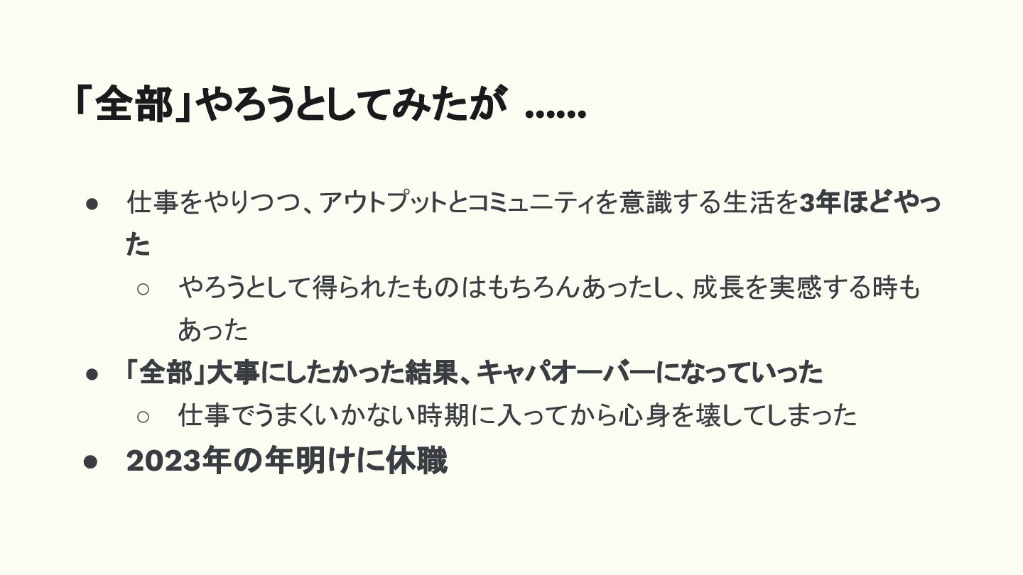 • 仕事をやりつつ、アウトプットとコミュニティを意識する生活を3年ほどやっ た ◦ やろうとして得られたものはもちろんあったし、成長を実感する時も あった • 「全部」大事にしたかった結果、キャパオーバーになっていった ◦ 仕事でうまくいかない時期に入ってから心身を壊してしまった