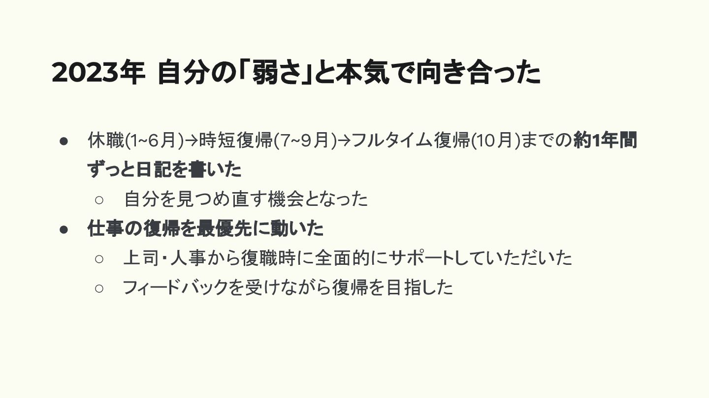 • 休職(1~6月)→時短復帰(7~9月)→フルタイム復帰(10月)までの約1年間 ずっと日記を書いた ◦ 自分を見つめ直す機会となった • 仕事の復帰を最優先に動いた ◦ 上司・人事から復職時に全面的にサポートしていただいた ◦