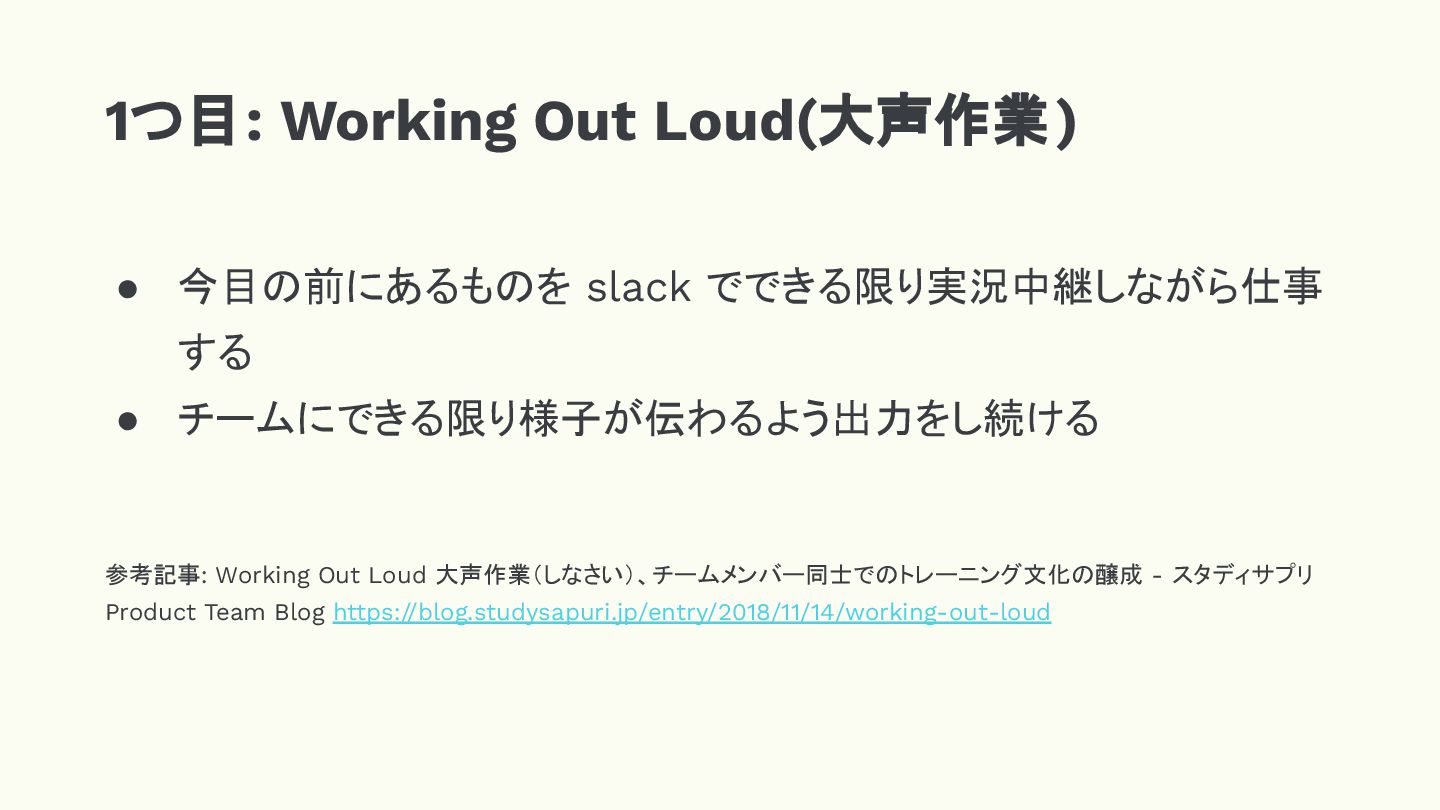 Loud 大声作業(しなさい)、チームメンバー同士でのトレーニング文化の醸成 - スタディサプリ Product Team Blog https://blog.studysapuri.jp/entry/2018/11/14/working-out-loud 1つ目: Working Out Loud(大声作業)